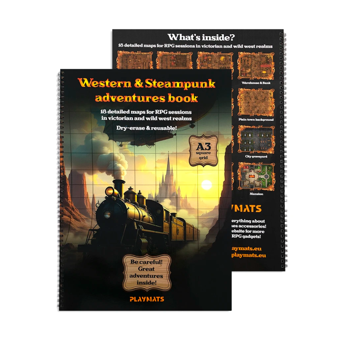 Księga do RPG - Western & Steampunk Adventures to praktyczne i klimatyczne narzędzie dla Mistrzów Gry oraz graczy, którzy kochają sesje w realiach westernu, steampunka i dzikich pograniczy. Niezależnie, czy prowadzisz kampanię w świecie Wolsunga, Deadlands czy autorskiej przygodzie w klimacie "pociągów, kurzu i zębatek", ta księga pomoże Ci szybko rozłożyć taktyczne pole gry i natychmiast wciągnąć uczestników w akcję.