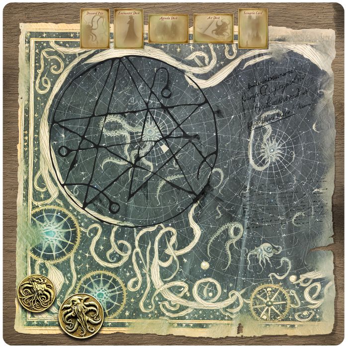 Antypoślizgowa, gumowa mata dedykowana do gry Arkham Horror LCG. Mata przedstawia morską mapę wyrysowaną na papirusie. Na macie są wyznaczone pola do gry. Taka oprawa wizualna pozwala lepiej wczuć się w grę, co znacznie zwiększa doznania z rozgrywki. Poza zwiększonymi walorami estetycznymi gry, mata dodatkowo chroni elementy przed zniszczeniem oraz przesuwaniem. Produkt nieoficjalny, kompatybilny z grą Arkham Horror LCG.