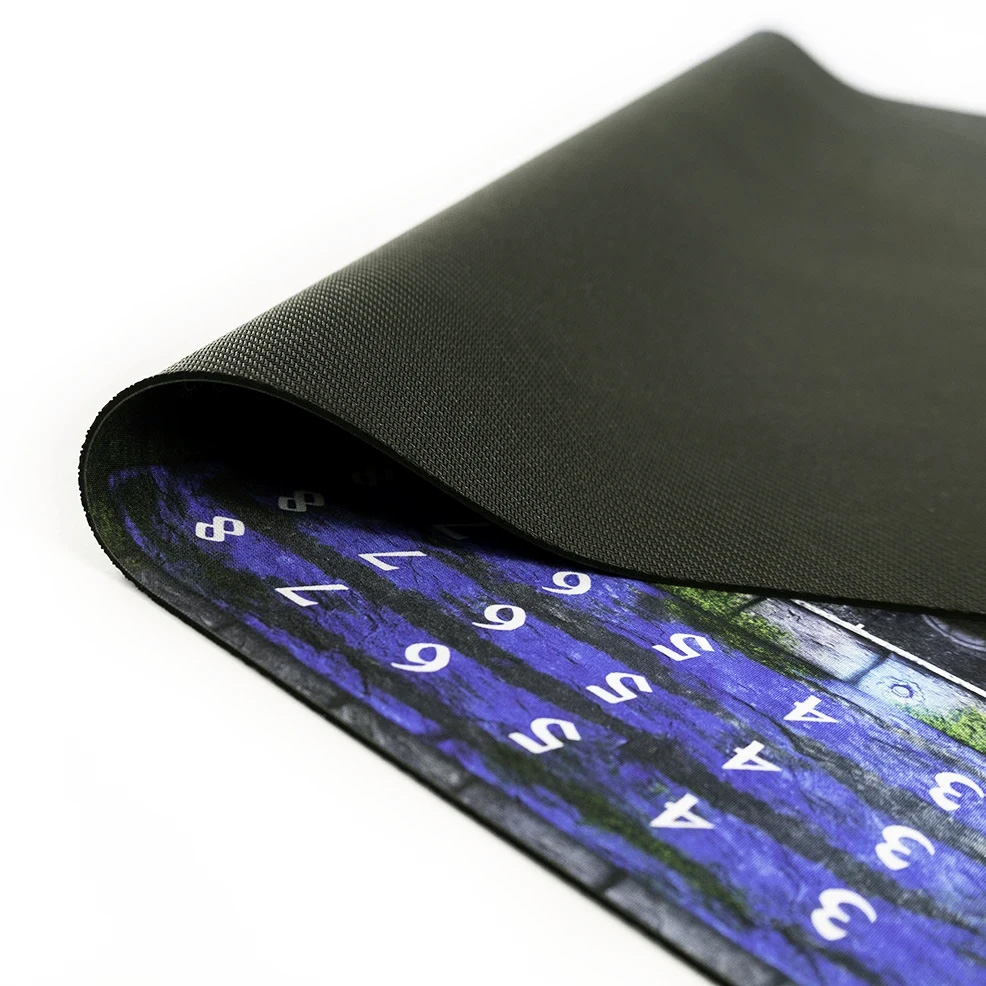 Mata wykonana jest z trwałej, elastycznej gumy o grubości 2 mm, z jednostronnym nadrukiem na tekstylnej powierzchni. Materiał świetnie przylega do stołu, nie zwija się i nie przesuwa w trakcie gry. Miękka struktura chroni figurki i kostki przed uszkodzeniem a całość można łatwo zwinąć i przechowywać bez obawy o trwałe zagniecenia.