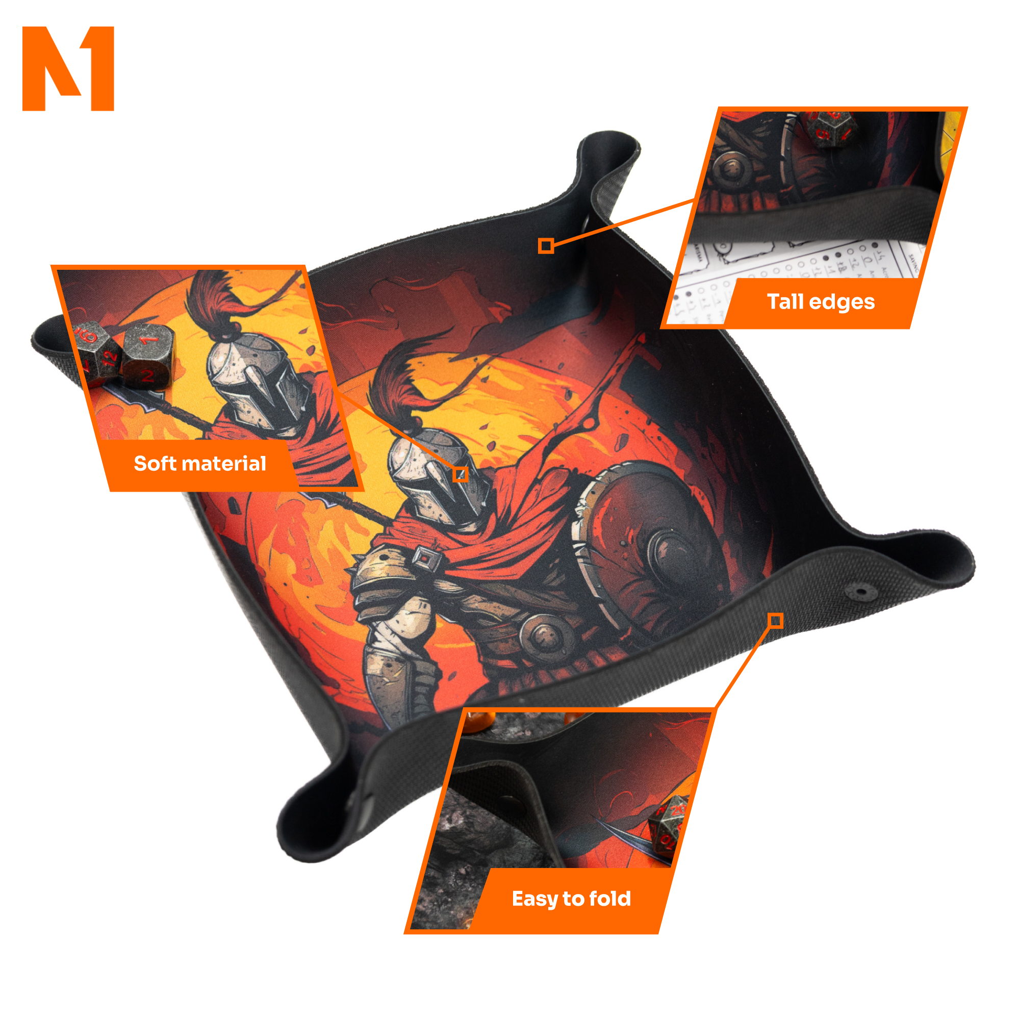 Wykonana z wysokiej jakości, trwałych materiałów, Dice Tray Gladiator to coś więcej niż tylko efektowny wygląd. Wytrzymały, a jednocześnie gładki materiał chroni Twoje kości i stół przed uszkodzeniami, redukuje hałas i utrzymuje kości w ryzach. Cztery solidne zatrzaski zapewniają stabilność podczas gry, ale umożliwiają również szybkie rozłożenie tacki, co ułatwia jej przenoszenie. Dzięki tej elastyczności tacka idealnie sprawdza się dla graczy w ruchu, którzy potrzebują niezawodnych akcesoriów bez kompromisu między stylem a praktycznością.