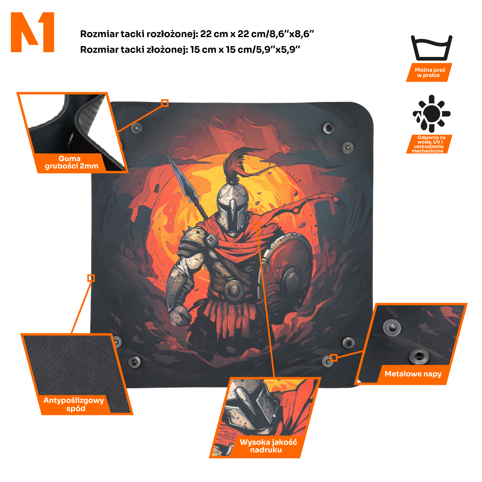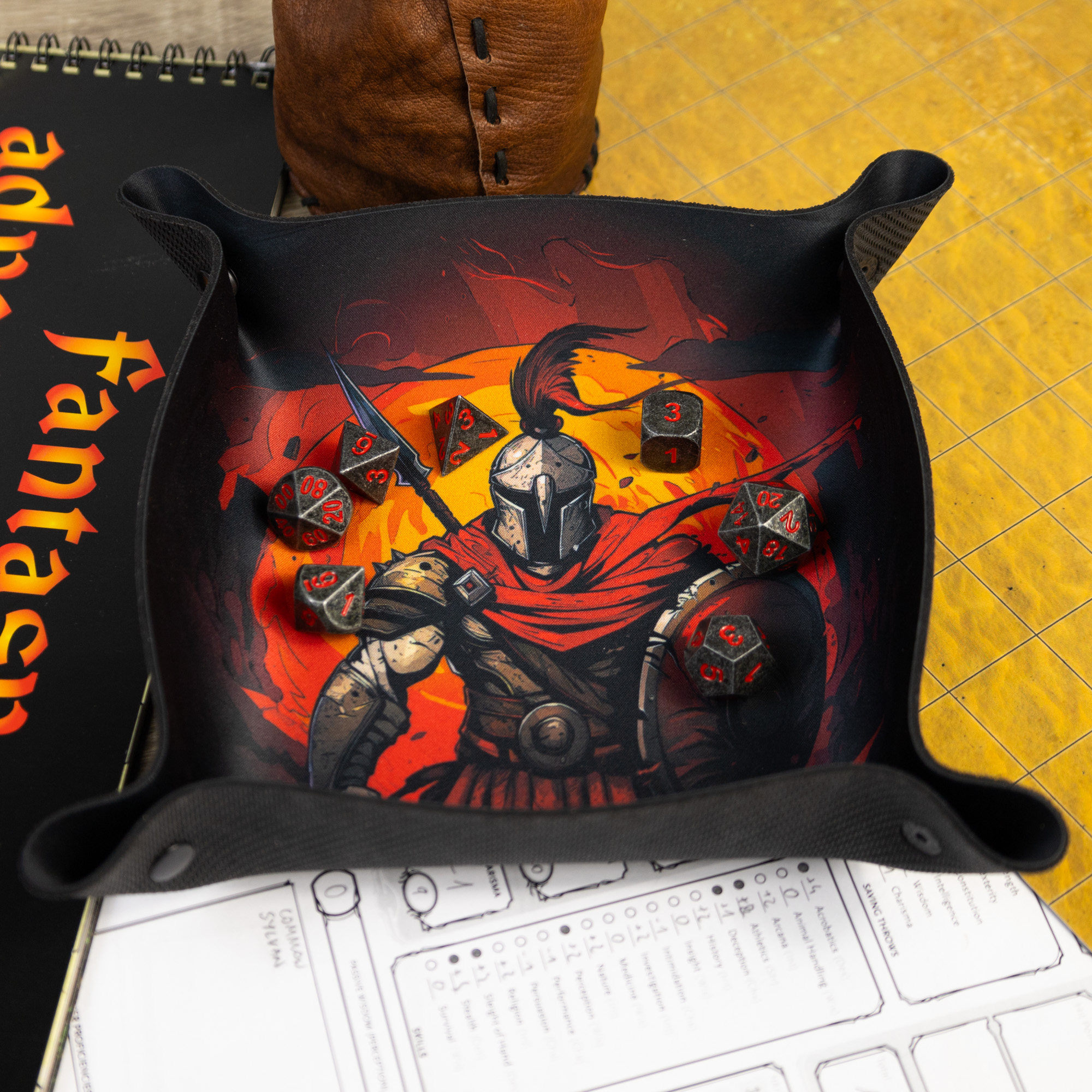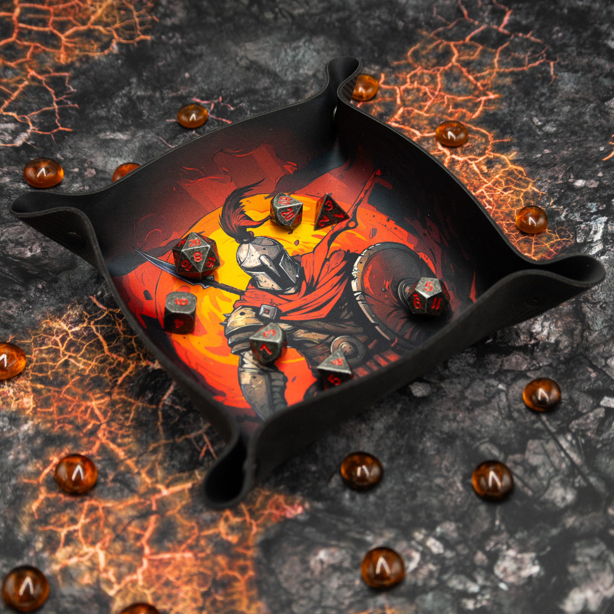 Zaprojektowana z inspirującym obrazem nieustraszonego gladiatora na tle płonącego zachodu słońca, tacka uchwyca istotę odwagi, siły i wytrwałości. Wojownik w pełnej zbroi, z tarczą i włócznią w dłoni, symbolizuje determinację potrzebną zarówno na starożytnych arenach, jak i podczas strategicznych rozgrywek. Jego stanowcza postawa, oświetlona ciepłym blaskiem zachodzącego słońca, przypomina graczom o bezwzględnej walce i bohaterstwie gladiatorów. Ta grafika nie tylko ozdabia tackę, ale również inspiruje, wciągając graczy w bardziej immersyjne doświadczenie przy każdym rzucie kośćmi.
