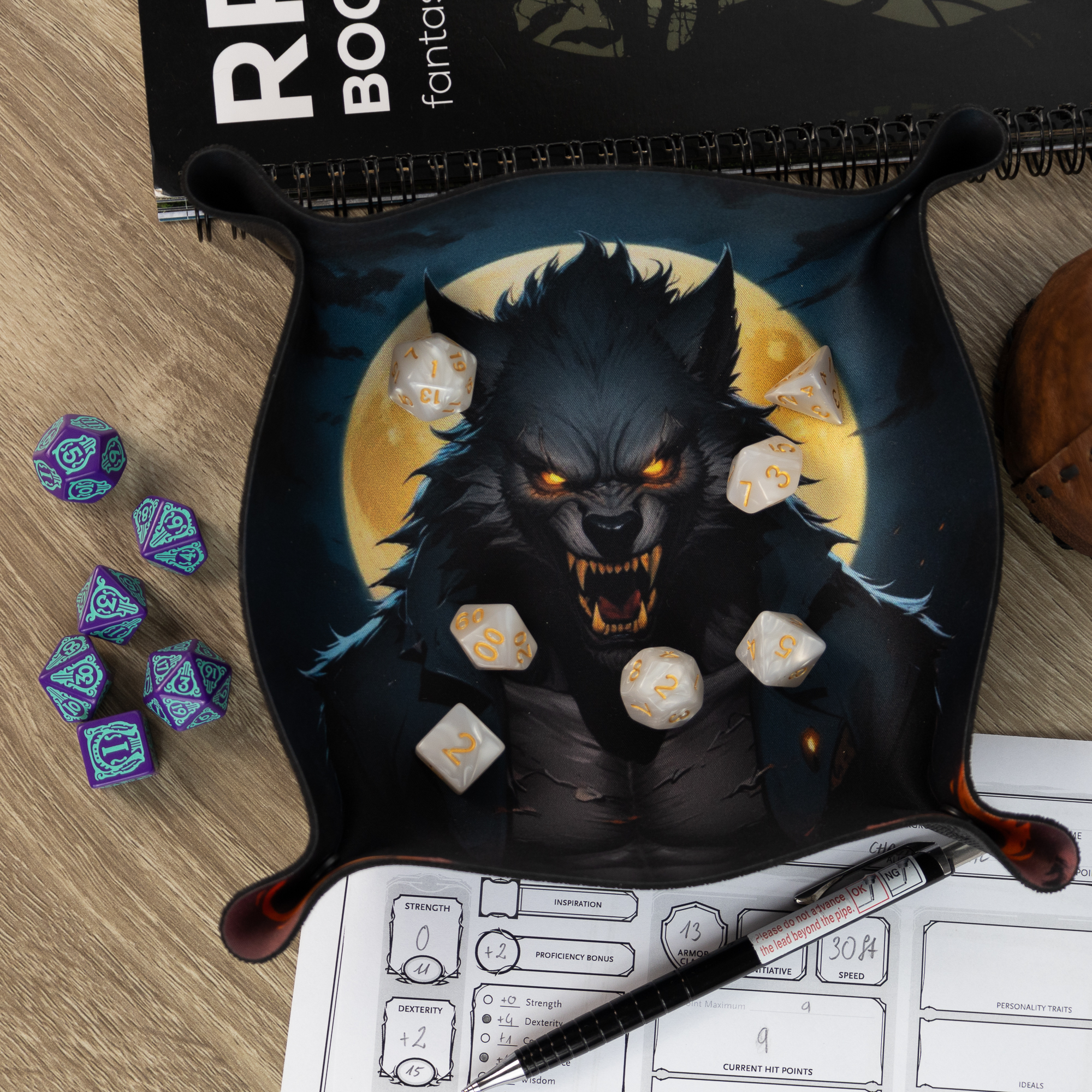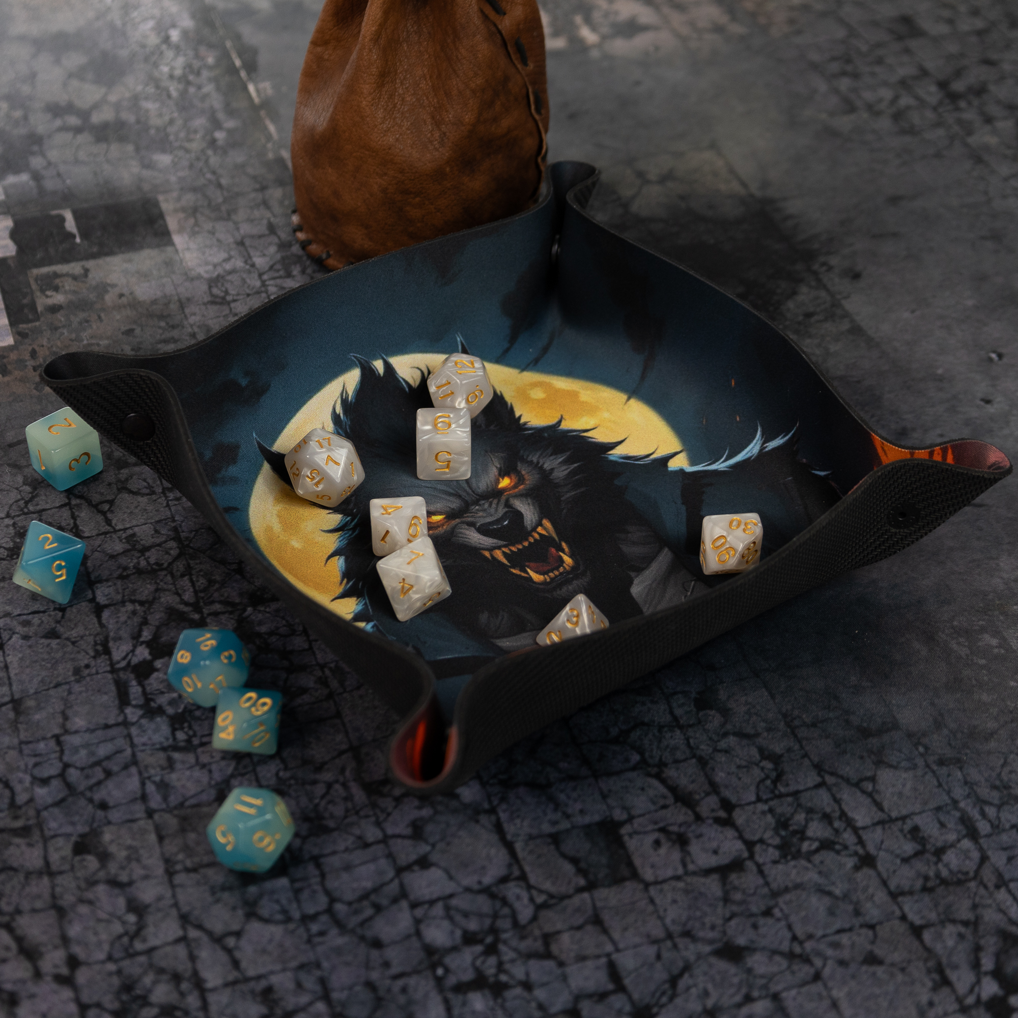 Wprowadź atmosferę grozy i mrocznej tajemnicy do swoich sesji RPG z Dice Tray "Wilkołak". Wykonany z wytrzymałej gumy, tacka zapewnia ochronę i wygodę podczas rzutów kośćmi. Zapewnij sobie idealne miejsce do rzutów dzięki wyrazistemu wzorowi wilkołaka na tle pełni księżyca, który zachwyci każdego gracza.
