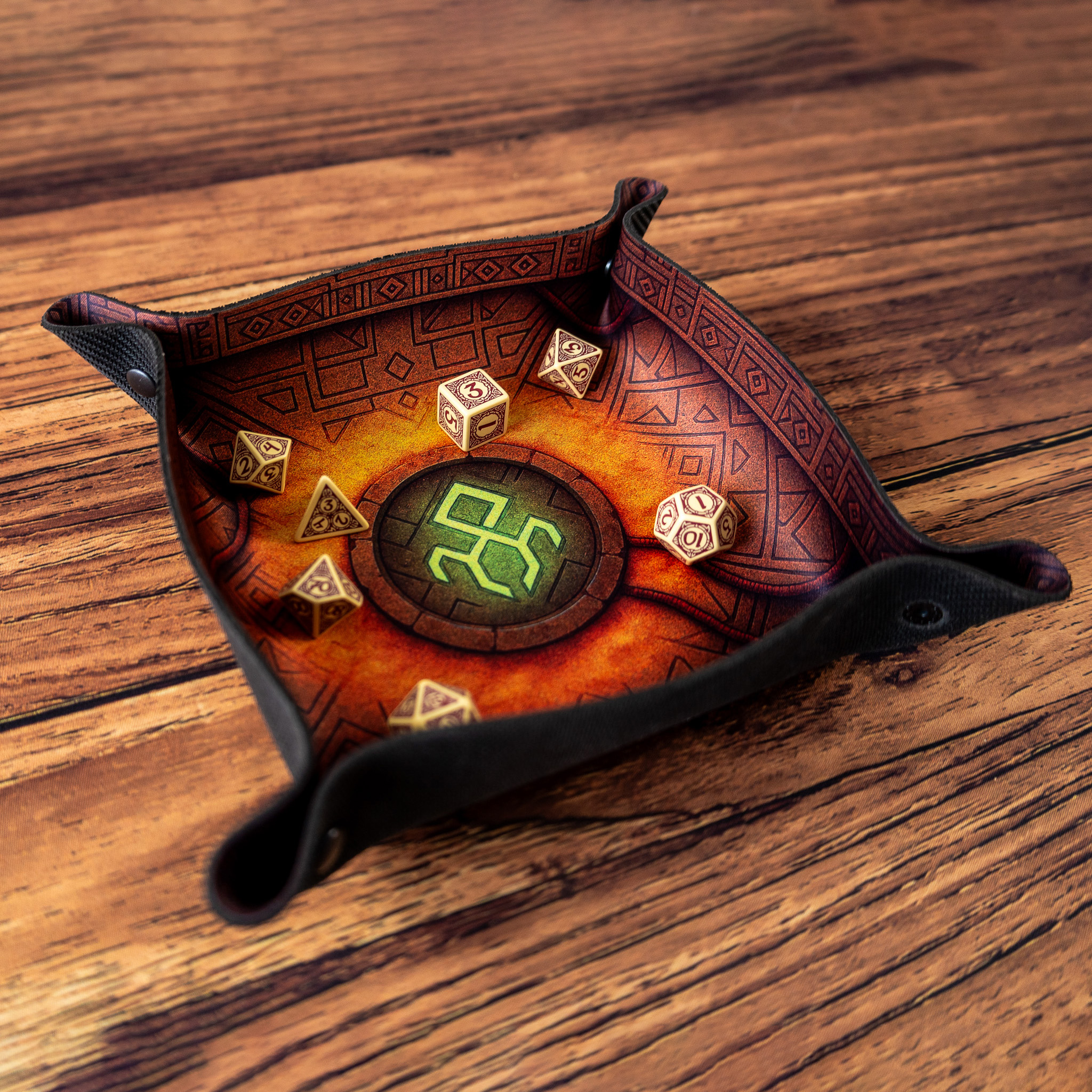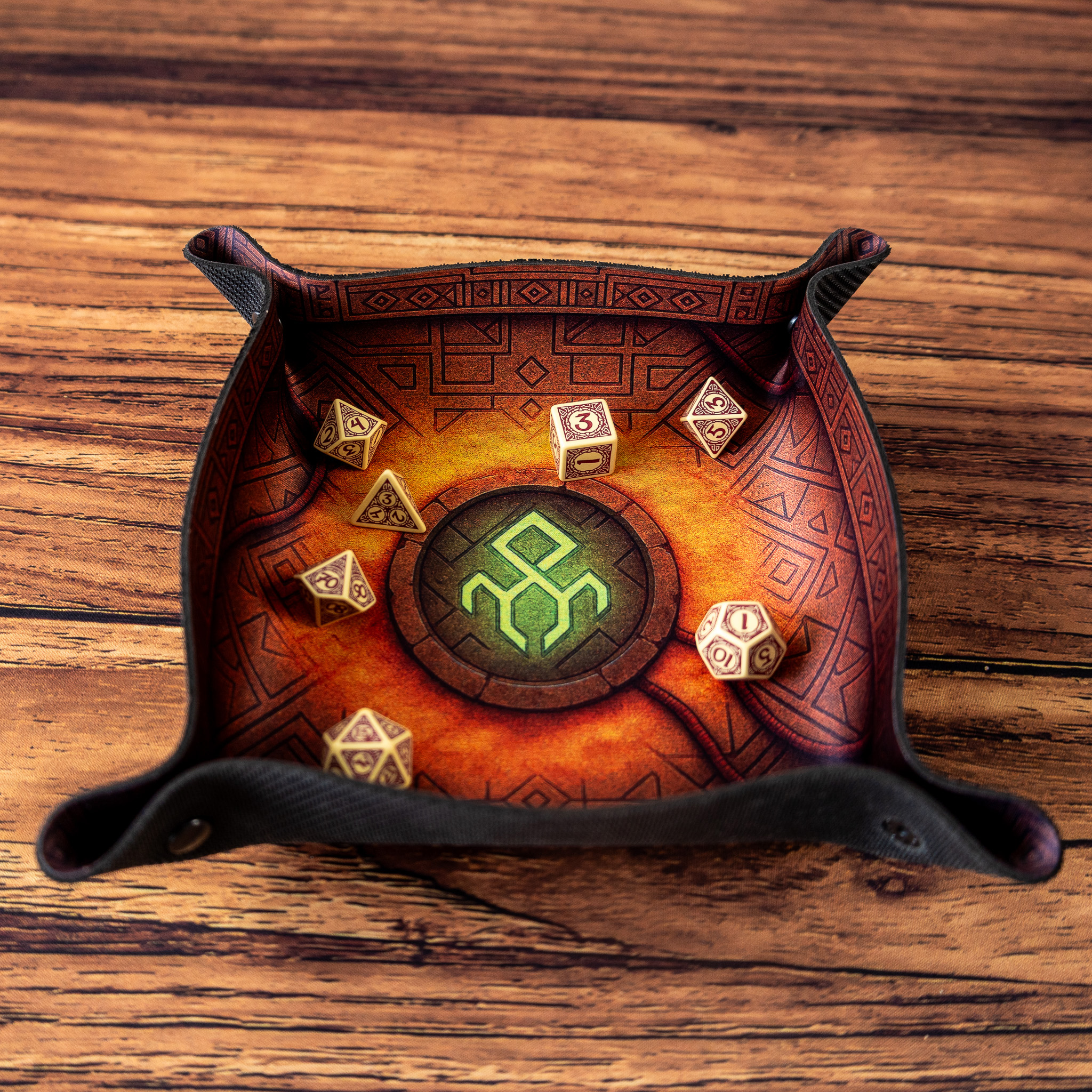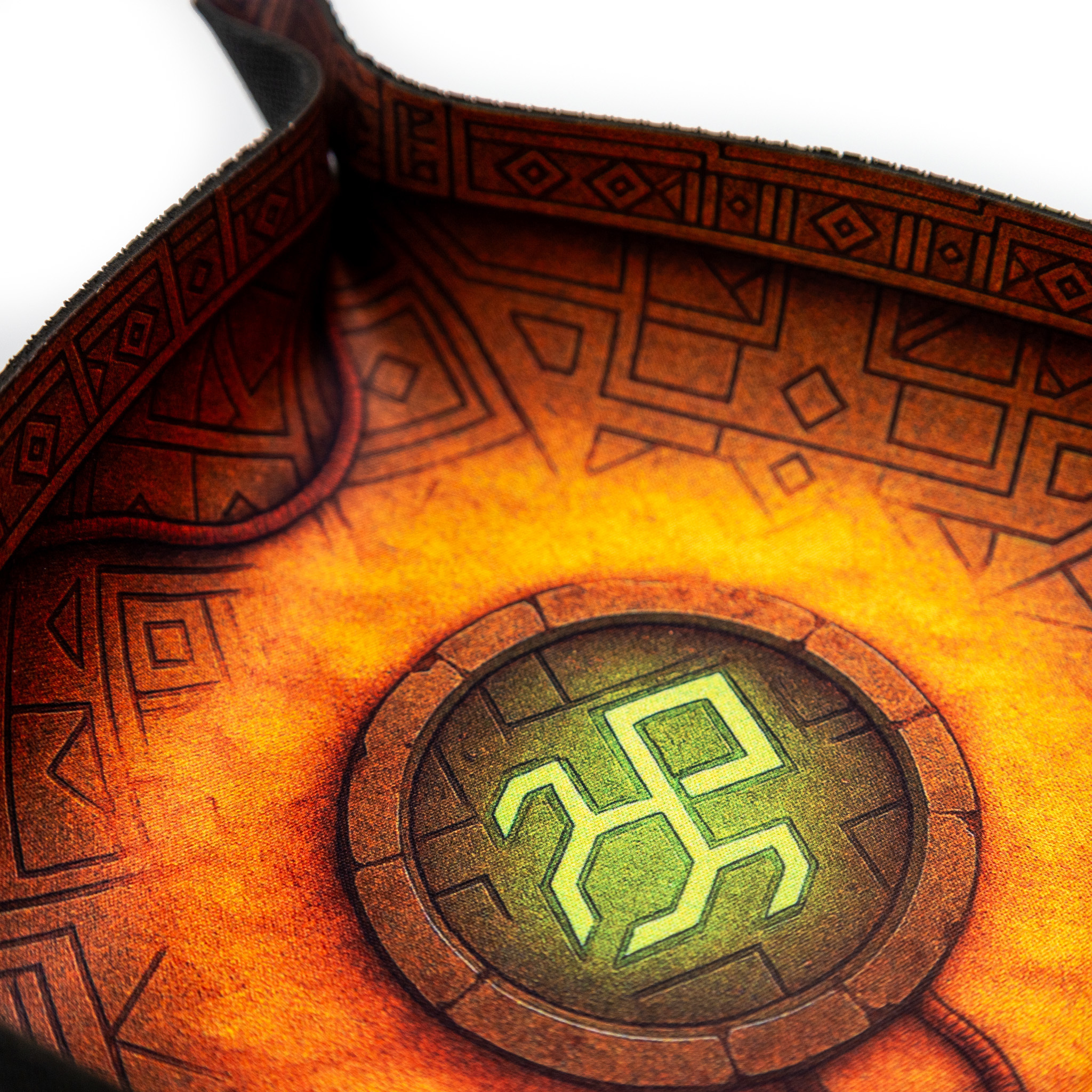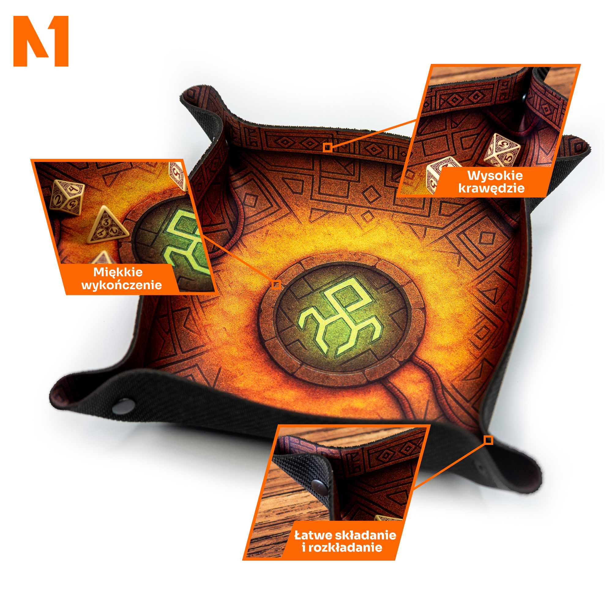 Pomarańczowe rozbłyski i zielony znak pośrodku przyciągają wzrok. Grafika nie ściera się nawet po wielu godzinach rzucania kostkami. Możesz bez obaw używać zarówno kostek metalowych, jak i żywicznych. Tacka nie tylko działa, ale też wygląda jak element większego uniwersum. W sam raz dla graczy, którzy lubią, kiedy nawet akcesoria mają swoją historię.