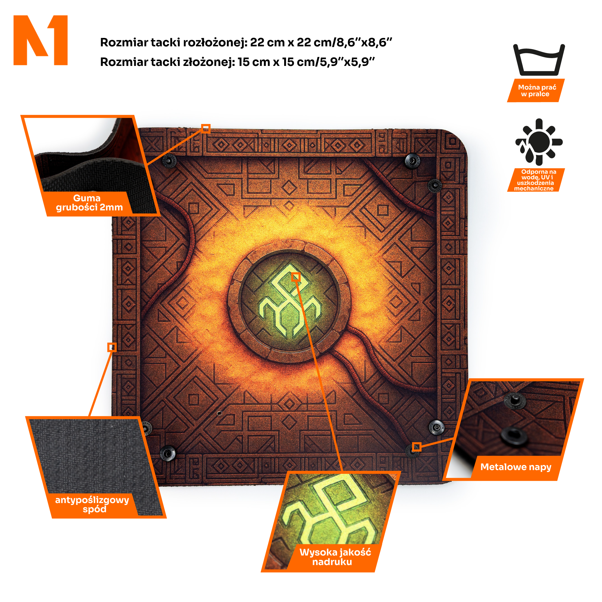 Tacka wykonana jest z 2-milimetrowej gumy z trwałym nadrukiem jednostronnym. Dzięki temu doskonale amortyzuje rzut kostkami i trzyma je w ryzach. Nie turlają się na boki, nie uderzają o figurki i nie spadają z krawędzi stołu. Nawet najbardziej spektakularne rzuty pozostają na swoim miejscu.