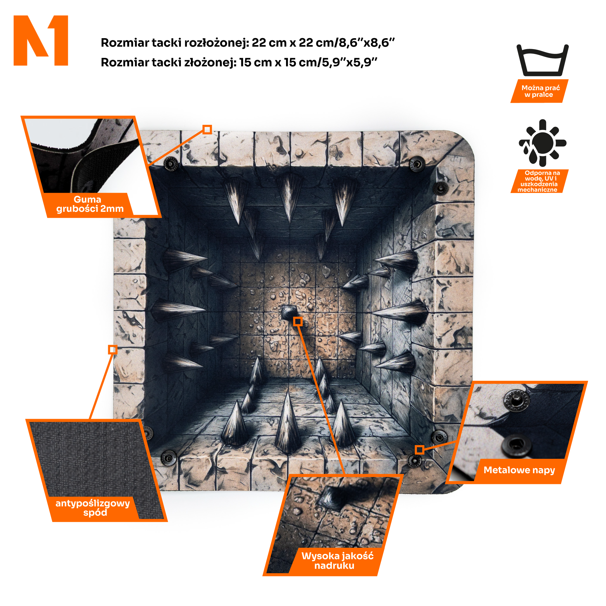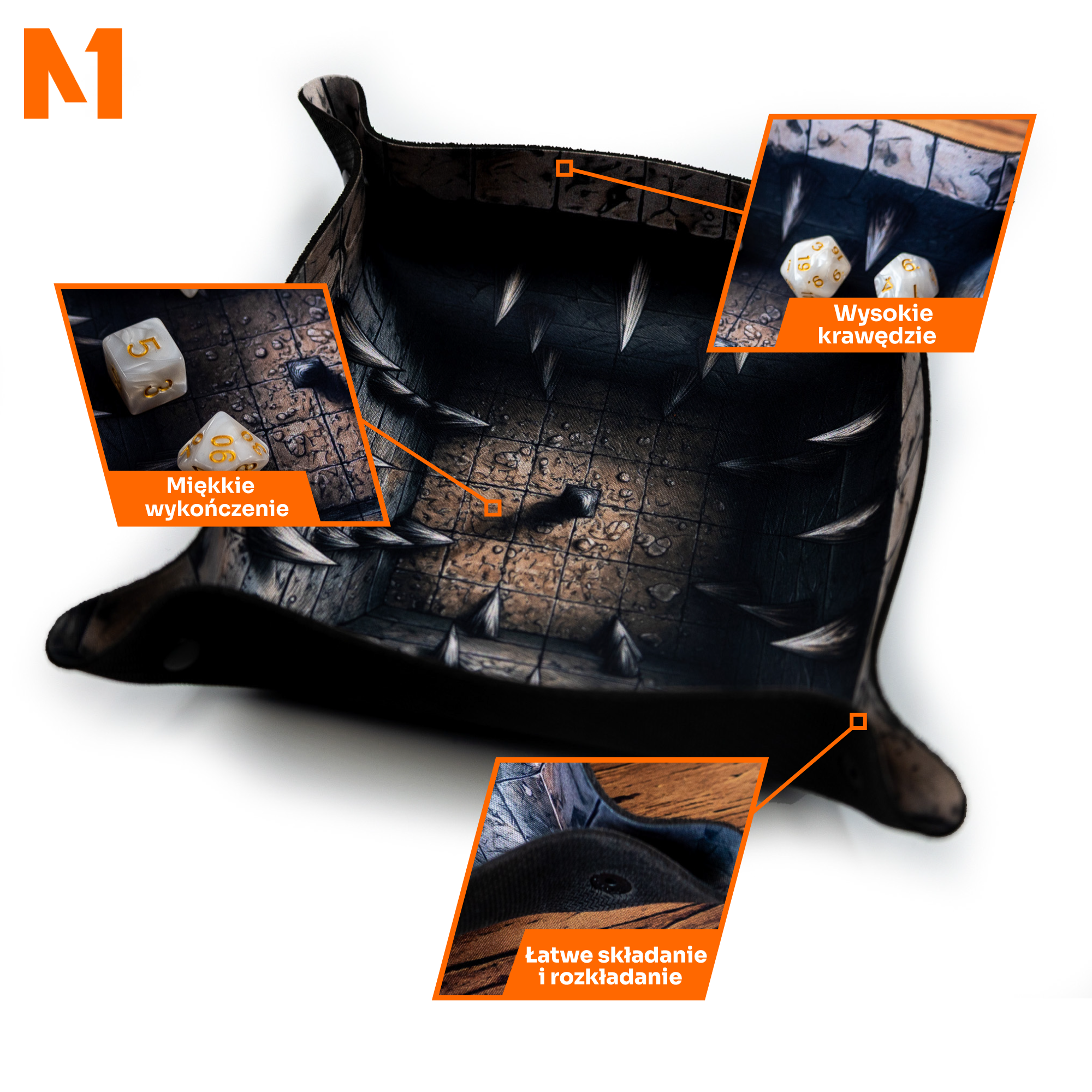 Zwinięta tacka mieści się w plecaku obok podręcznika i woreczka z kostkami. Rozłożona wygląda jak wyjęta prosto z lochów, ale jest odporna na intensywne użytkowanie. Nie straszne jej metalowe kostki czy ciężkie d20. Nadruk nie ściera się, kolory pozostają wyraziste nawet po wielu sesjach.