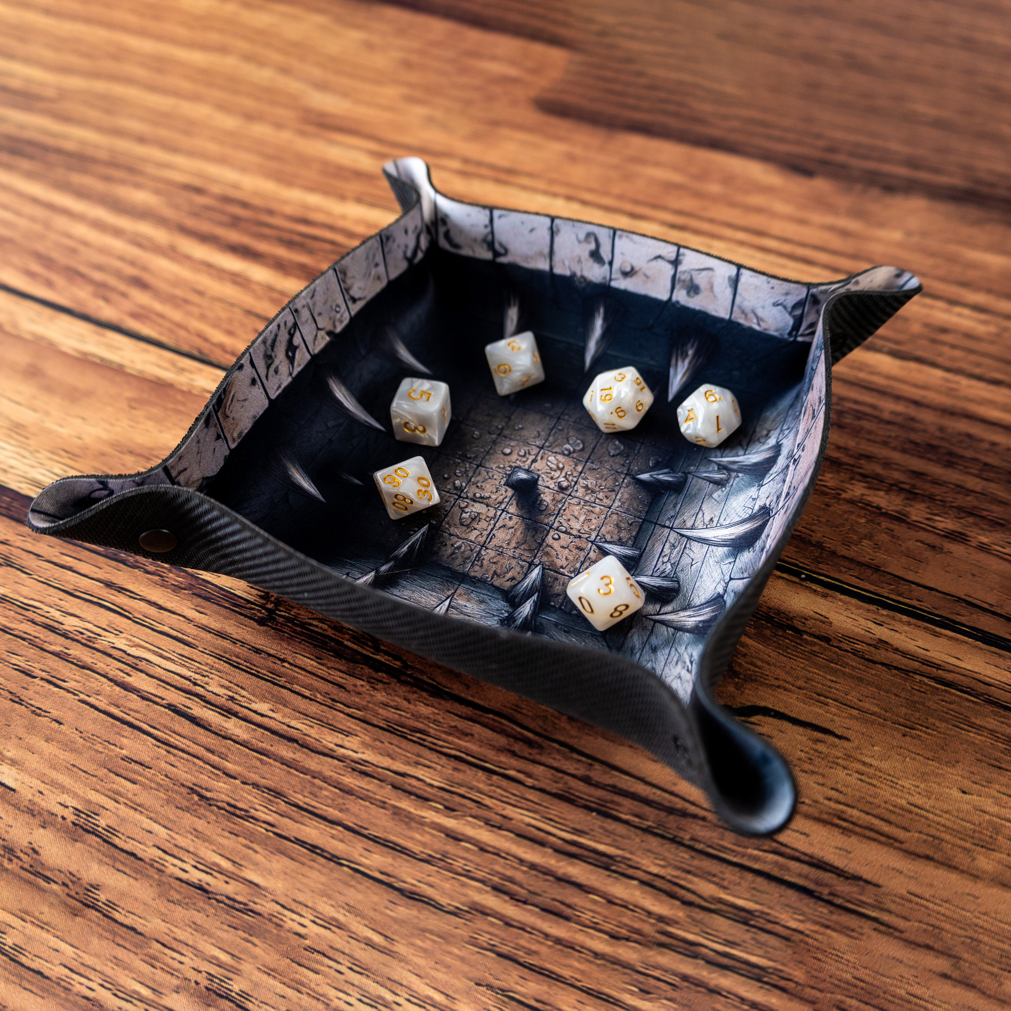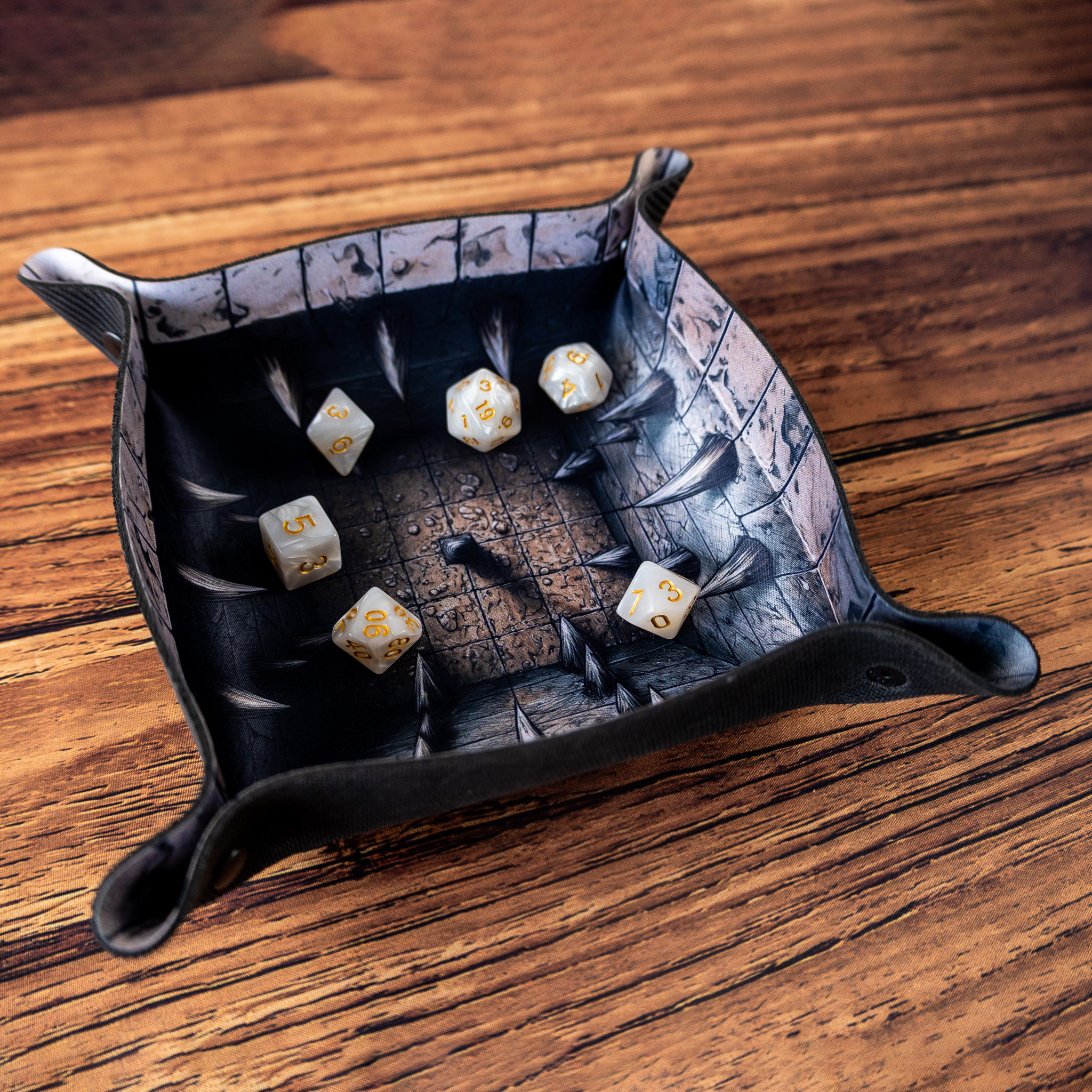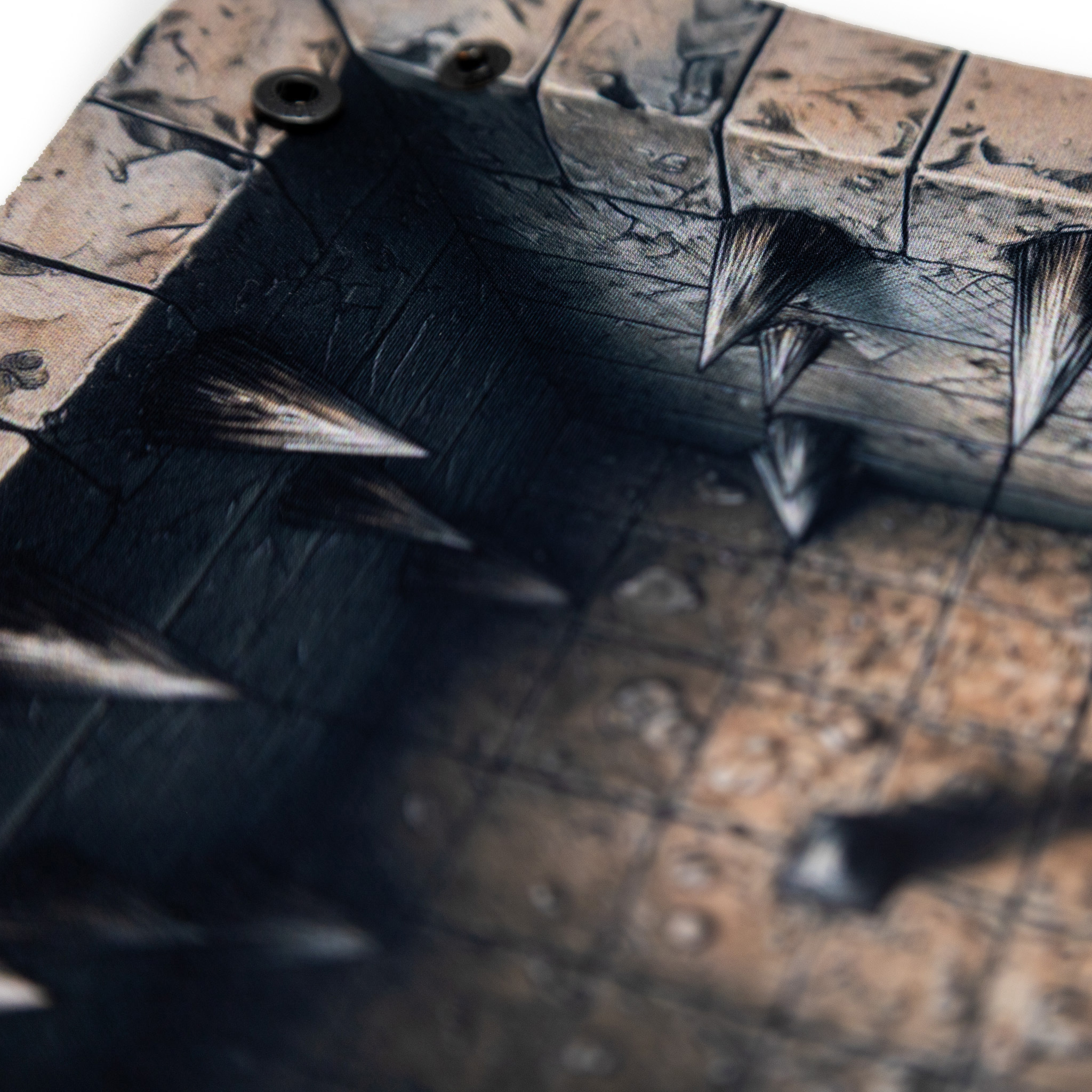 Wzór tacki to klasyczne dungeon crawlowe zagrożenie. Kamienne ściany, ostre kolce, mroczne światło - wszystko jak z podręcznika do Dungeons & Dragons. To doskonały gadżet do sesji, które stawiają na eksplorację podziemi i poczucie zagrożenia. Będzie pasować do takich systemów jak Pathfinder czy Warhammer Fantasy Roleplay.