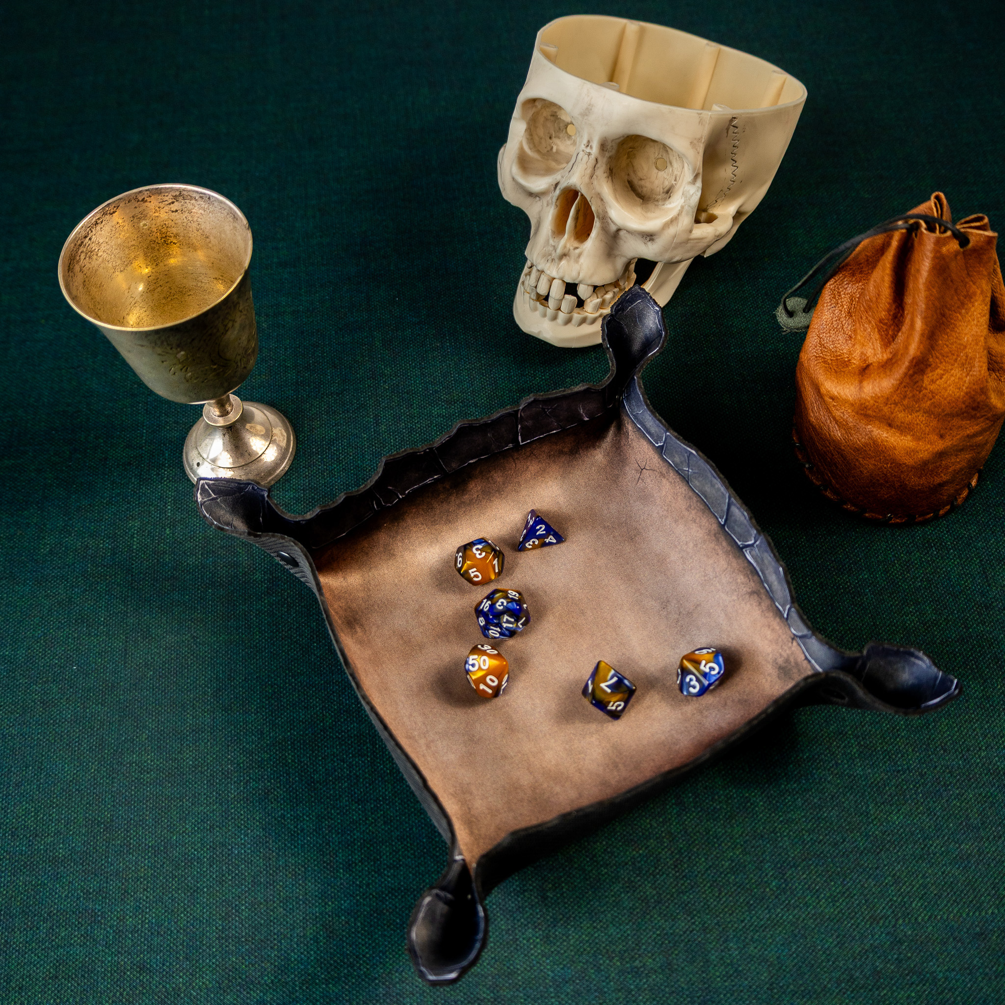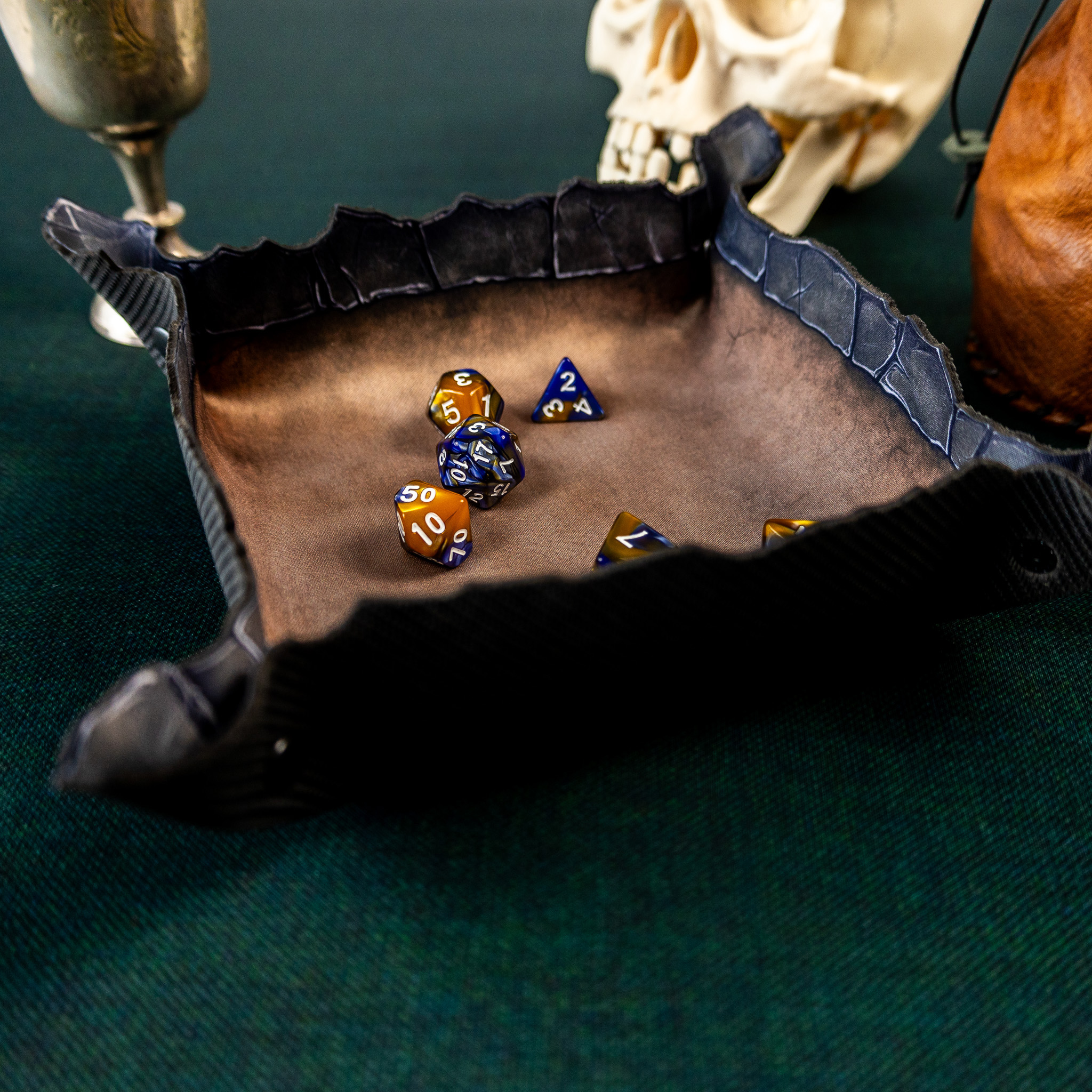 Wykonana z trwałej gumy o grubości 2 mm, tacka jest odporna na zagniecenia, rolowanie w plecaku i szaleństwa pechowych rzutów. Wewnętrzna powierzchnia z jednostronnym nadrukiem w kolorze postarzanego brązu przypomina stary, wypłowiały kamień. Ale prawdziwy atut to ranty - ich kształt nie jest przypadkowy. Nieregularne, przypominające pęknięcia w skalnej krawędzi dodają klimatu i naturalnie zatrzymują toczące się kostki.