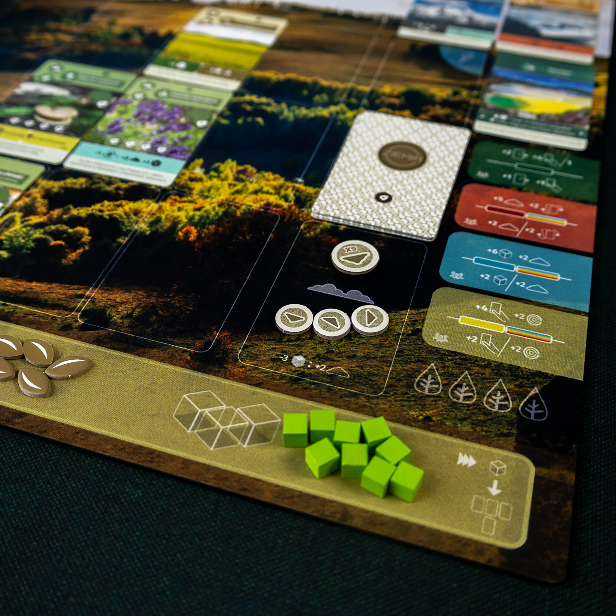 Każda mata wykonana została z 2 mm gumy z jednostronnym nadrukiem. Materiał doskonale przylega do stołu, nie ślizga się i zapewnia wygodę użytkowania. Dzięki przemyślanej grafice zastępuje klasyczne planszetki: znajdziesz na niej miejsce na karty ziemi, wyspy, klimatu oraz skrót dostępnych akcji – wszystko w zasięgu wzroku i ręki.