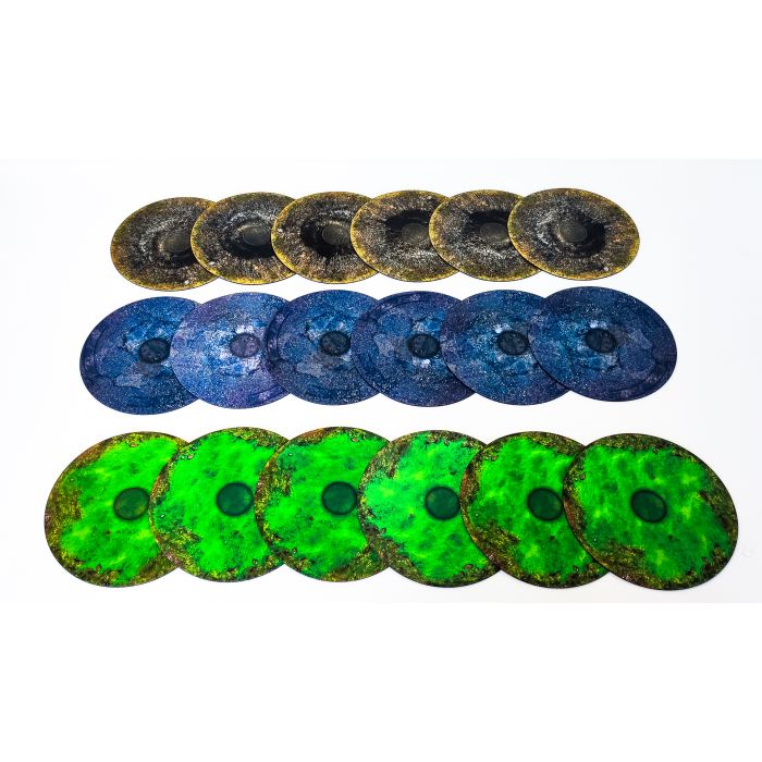 Wysokiej jakości gumowe tereny 2D z antypoślizgową powierzchnią. Łączy w sobie funkcjonalność klasycznych terenów oraz komfort stawiania na nich figurek. Jeden zestaw składa się z sześciu terenów 2D.