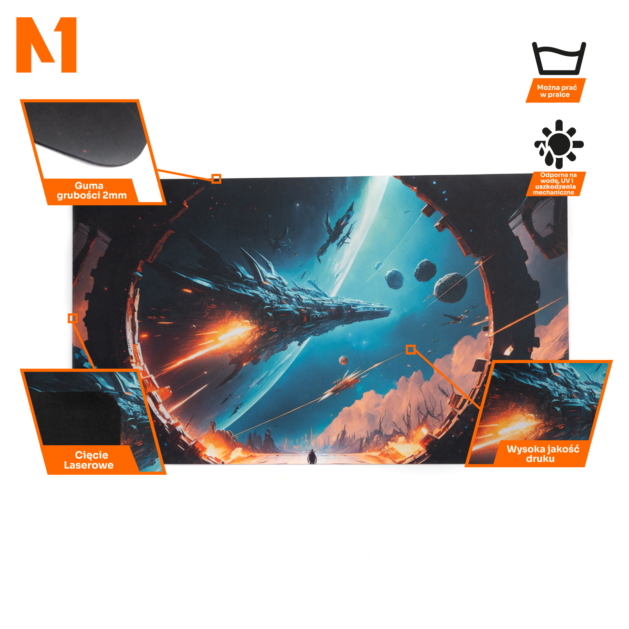 Niezwykła grafika, przedstawiająca ogromny statek kosmiczny otoczony przez planety i gwiazdy, została wydrukowana w wysokiej rozdzielczości, co pozwala cieszyć się każdym detalem. Barwne, intensywne kolory sprawiają, że mata przyciąga wzrok i nadaje rozgrywkom niezwykłego klimatu. Każdy fan science fiction z pewnością doceni staranność, z jaką wykonano ten projekt.