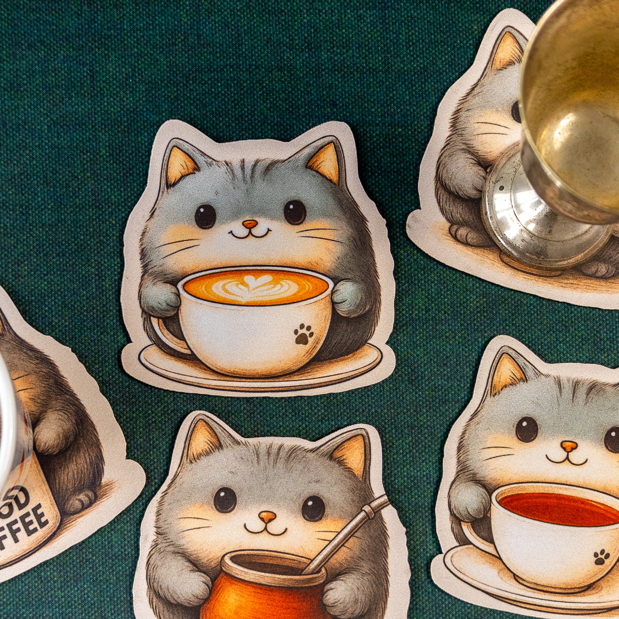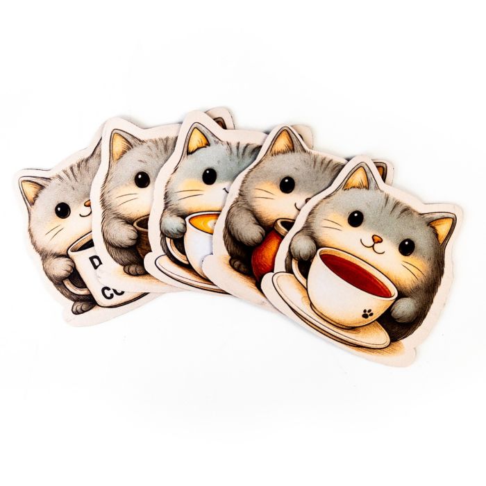 Znasz to uczucie, gdy kawa ląduje na kartach postaci, a herbata zostawia ślad na planszy? Oto antidotum, które nie tylko chroni stół, ale też wywołuje uśmiech. Kotkładki to zestaw pięciu podkładek pod kubek wykonanych z gumy o grubości 2 mm, z jednostronnym nadrukiem przedstawiającym urocze szare kotki, z których każdy dzierży inny napój – od latte z artystyczną pianką, przez yerbę, po mocną czarną kawę z napisem „Damn Good Coffee”.