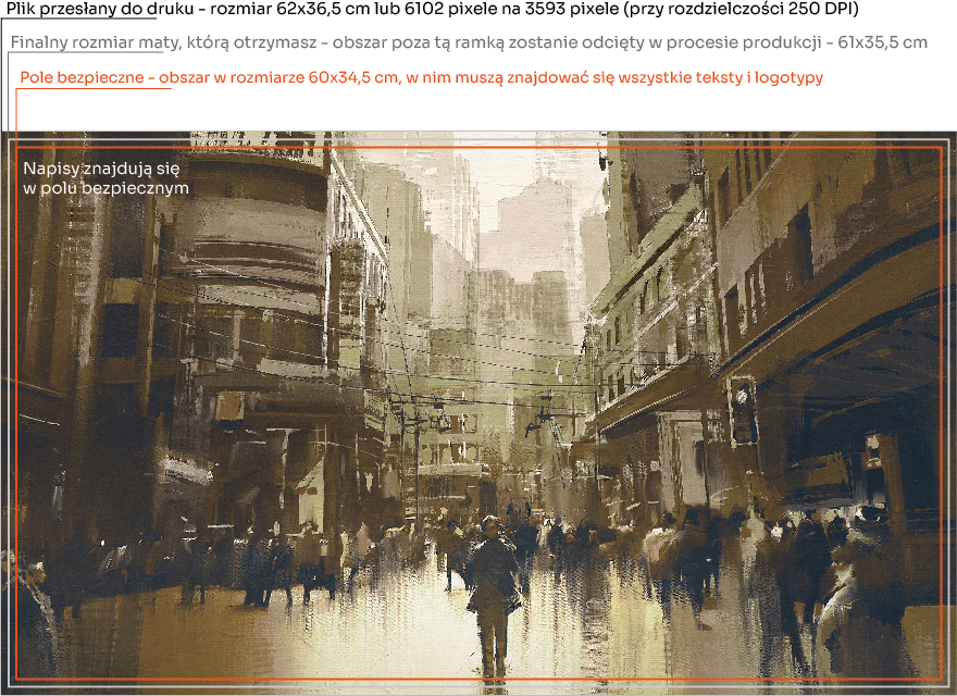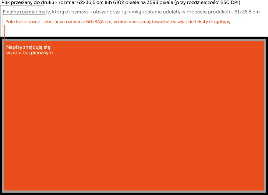 Przykład reprezentatywny: Plik do druku maty do gier karcianych w rozmiarze 61x35,5 cm przygotowany zgodnie z wytycznymi, powinien mieć rozmiar 620x365 mm, co przy rozdzielczości 250 DPI przekłąda się na wymiary 6102 pixele na 3593 pixele. Dodatkowo wszystkie elementy ważne dla projektu, które nie mogą zostać ścięte ani znaleźć się zbyt blisko krawędzi powinny mieścić się w obrzarze 600x345 mm (czyli 5906x3396 pixeli).