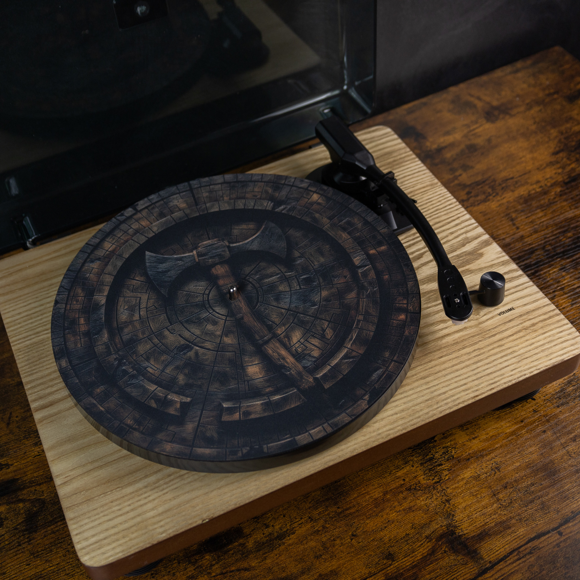 Wzór przedstawiający potężny topór, otoczony drewnianą teksturą, przyciąga uwagę i nadaje gramofonowi niepowtarzalny charakter. Ten wyjątkowy design zainspirowany został motywami bitewnymi, co czyni slipmatę idealnym wyborem dla miłośników fantasy, RPG i średniowiecznych klimatów. Połączenie szczegółowej grafiki z subtelnymi barwami brązu i drewna wprowadza atmosferę surowości i klasy.