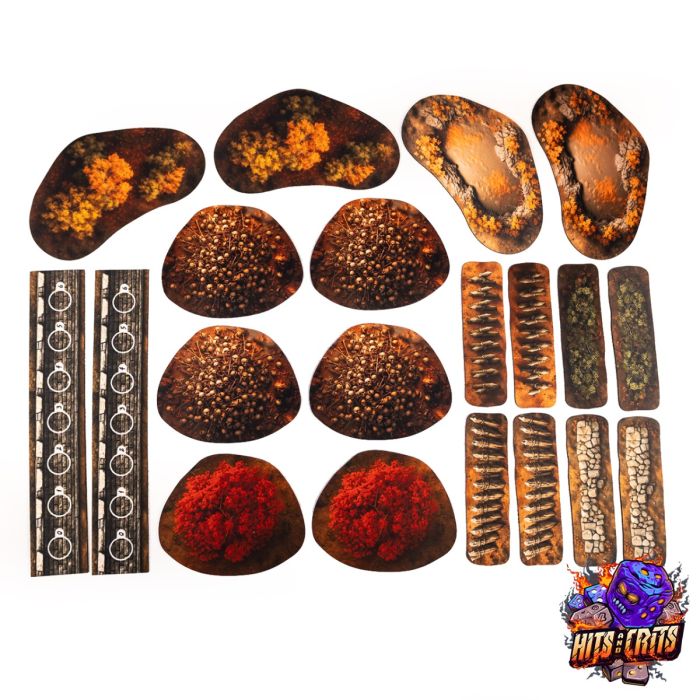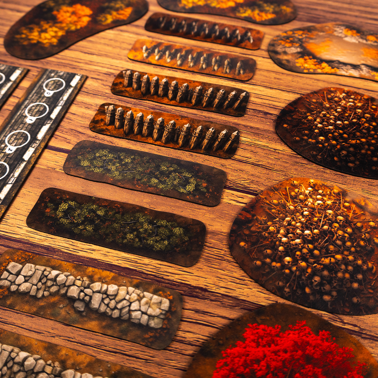 2x Palisada, 2x Drewniana barykada (Stakes), 2x Murek, 2x Żywopłot: Zestaw przeszkód terenowych, które pozwalają kształtować pole bitwy, blokować szarże i tworzyć strefy obronne dla Twoich oddziałów.