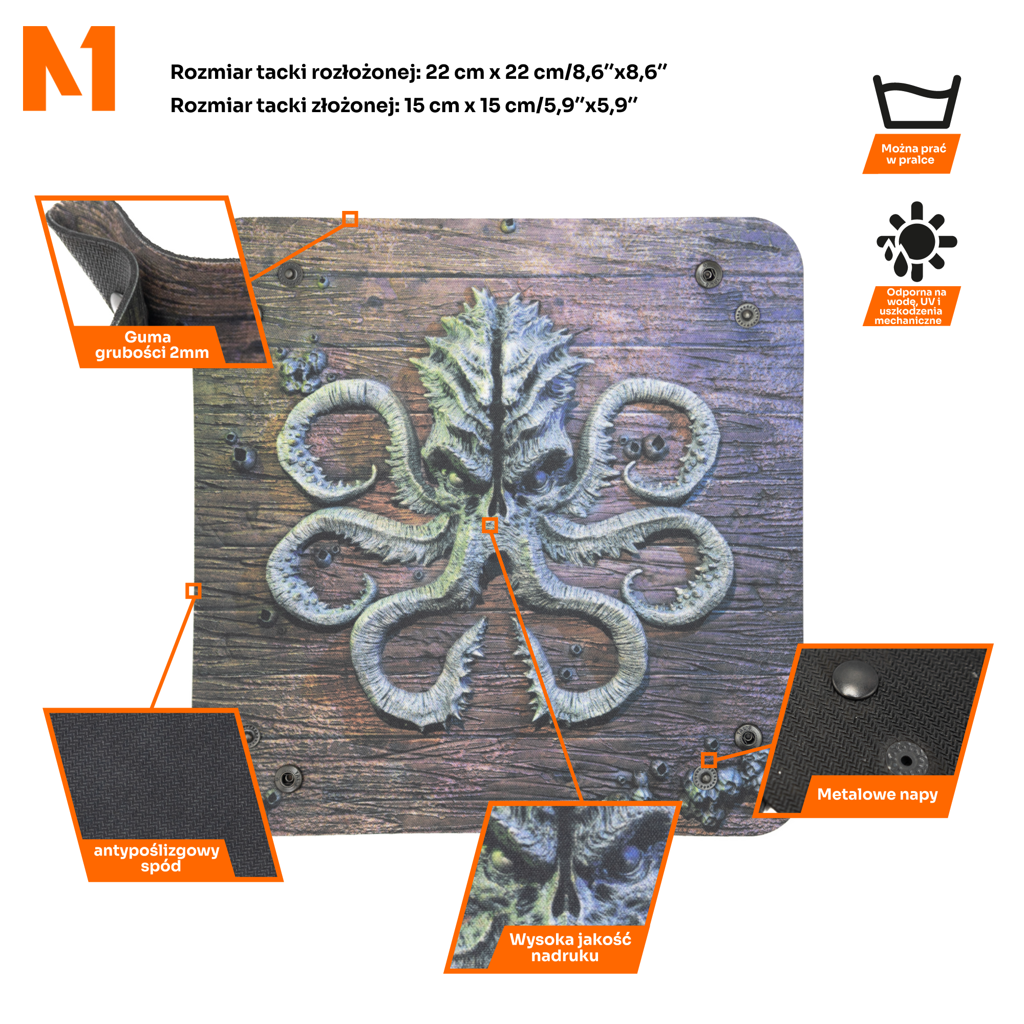 Dzięki składanej konstrukcji tacka „Kraken” jest nie tylko stylowa, ale także wyjątkowo przenośna. Możesz ją z łatwością złożyć, schować do torby i zabrać ze sobą na turnieje, konwenty czy zwykłe spotkania z przyjaciółmi. Solidne zatrzaski pozwalają na szybkie rozłożenie i zapewniają, że tacka zachowa swój kształt podczas gry. Gładka powierzchnia gumy sprawia, że tacka jest łatwa w utrzymaniu – wystarczy przetarcie, by wyglądała jak nowa.