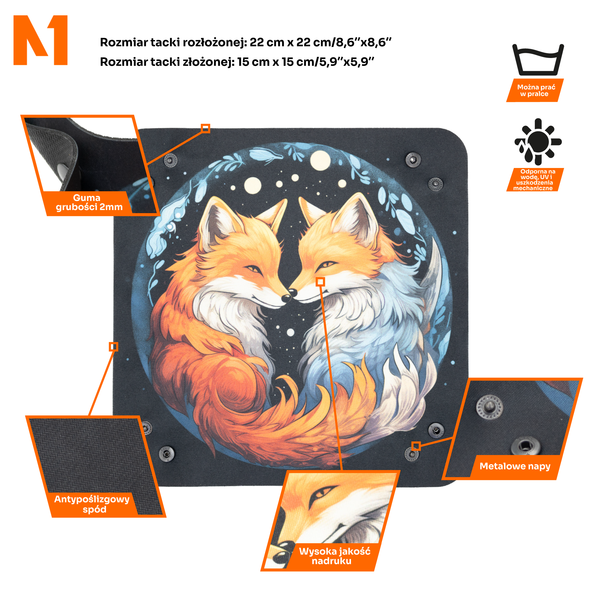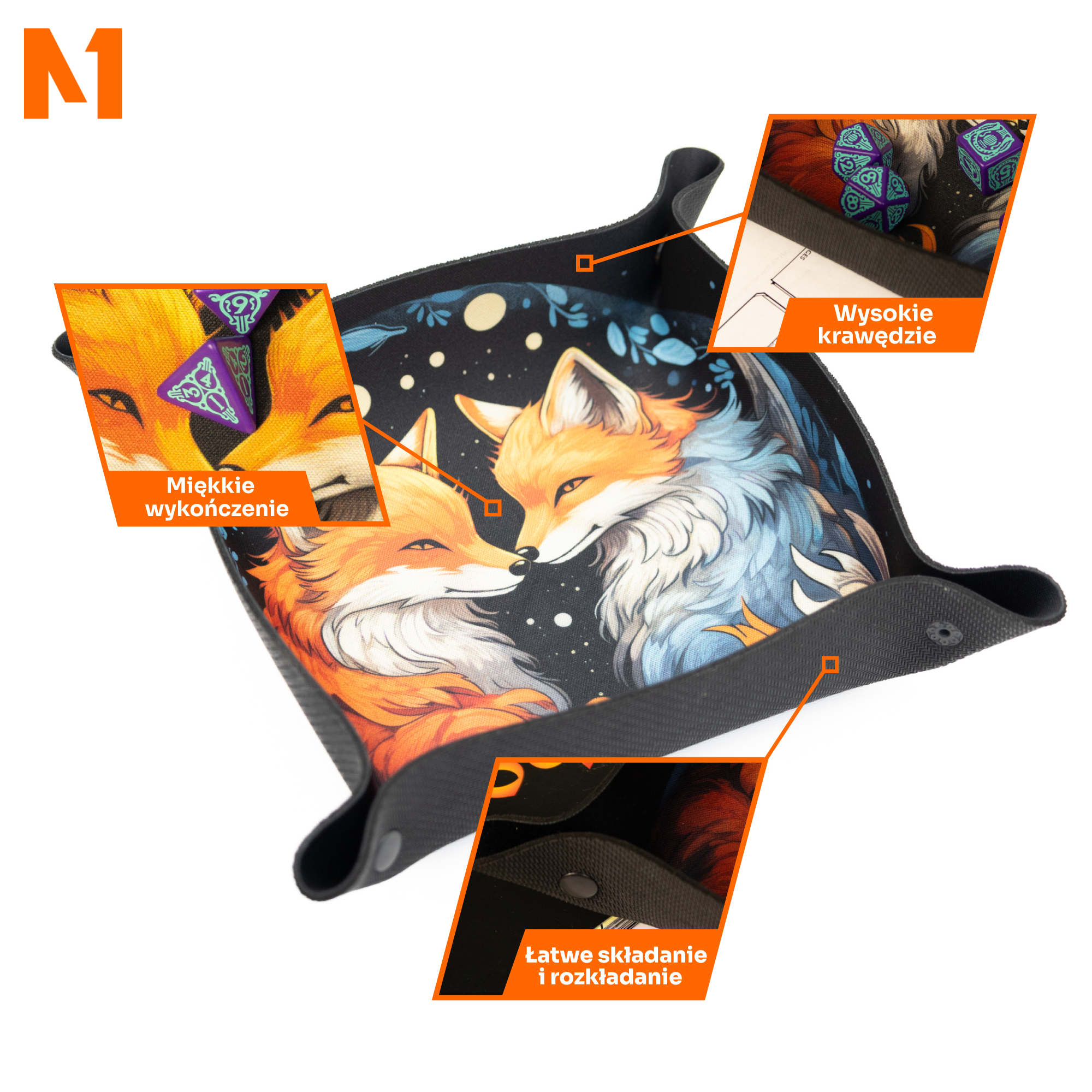 Dice Tray „Lisie Dusze” to wyjątkowa tacka do rzutów kostkami, która wprowadza do gry magiczny klimat. Zainspirowana naturą i tajemniczymi lisami symbolizującymi spryt i ochronę, świetnie pasuje do gier bitewnych, planszowych oraz RPG. Dzięki solidnemu wykonaniu z neoprenu, Twoje kostki zawsze wylądują bezpiecznie. Idealna dla graczy szukających praktycznego, a jednocześnie pięknego akcesorium.