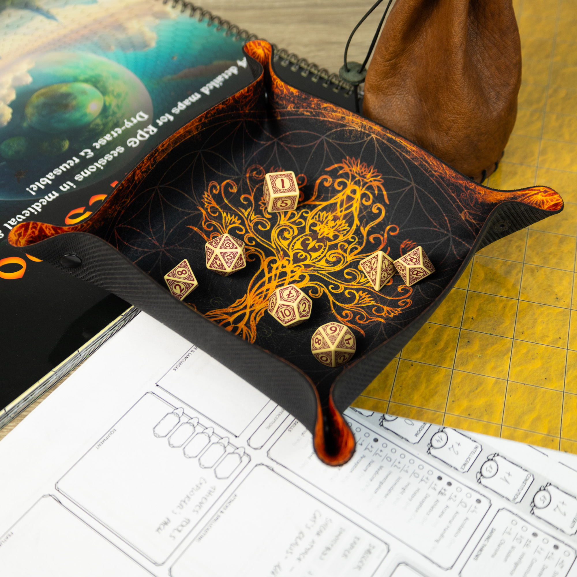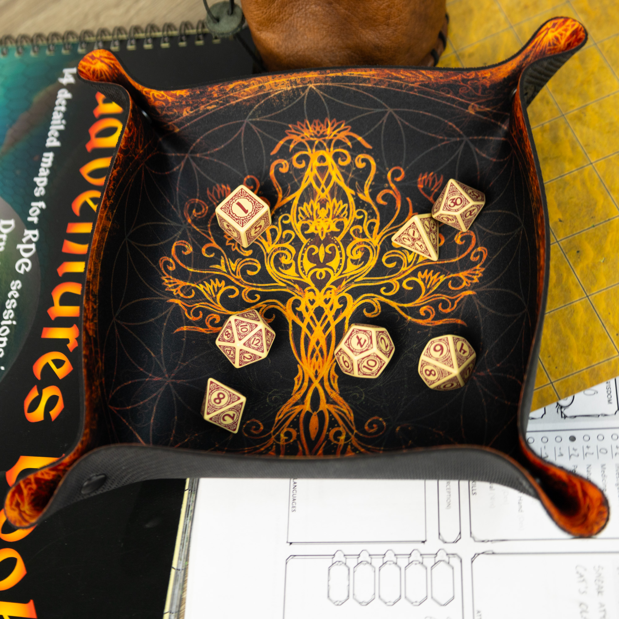 Wykonana z najwyższej jakości materiałów, tacka zapewnia trwałość i komfort użytkowania nawet podczas najintensywniejszych sesji gry. Jej stabilna konstrukcja umożliwia ciche i precyzyjne rzuty kostkami, co pozwala skupić się na fabule i atmosferze gry, bez zbędnych zakłóceń. Wnętrze tacki zdobi szczegółowy wzór drzewa życia, który stanowi symbol połączenia natury i magii – idealny dodatek do każdej sesji, w której magia, tajemnica i przygoda odgrywają kluczową rolę.