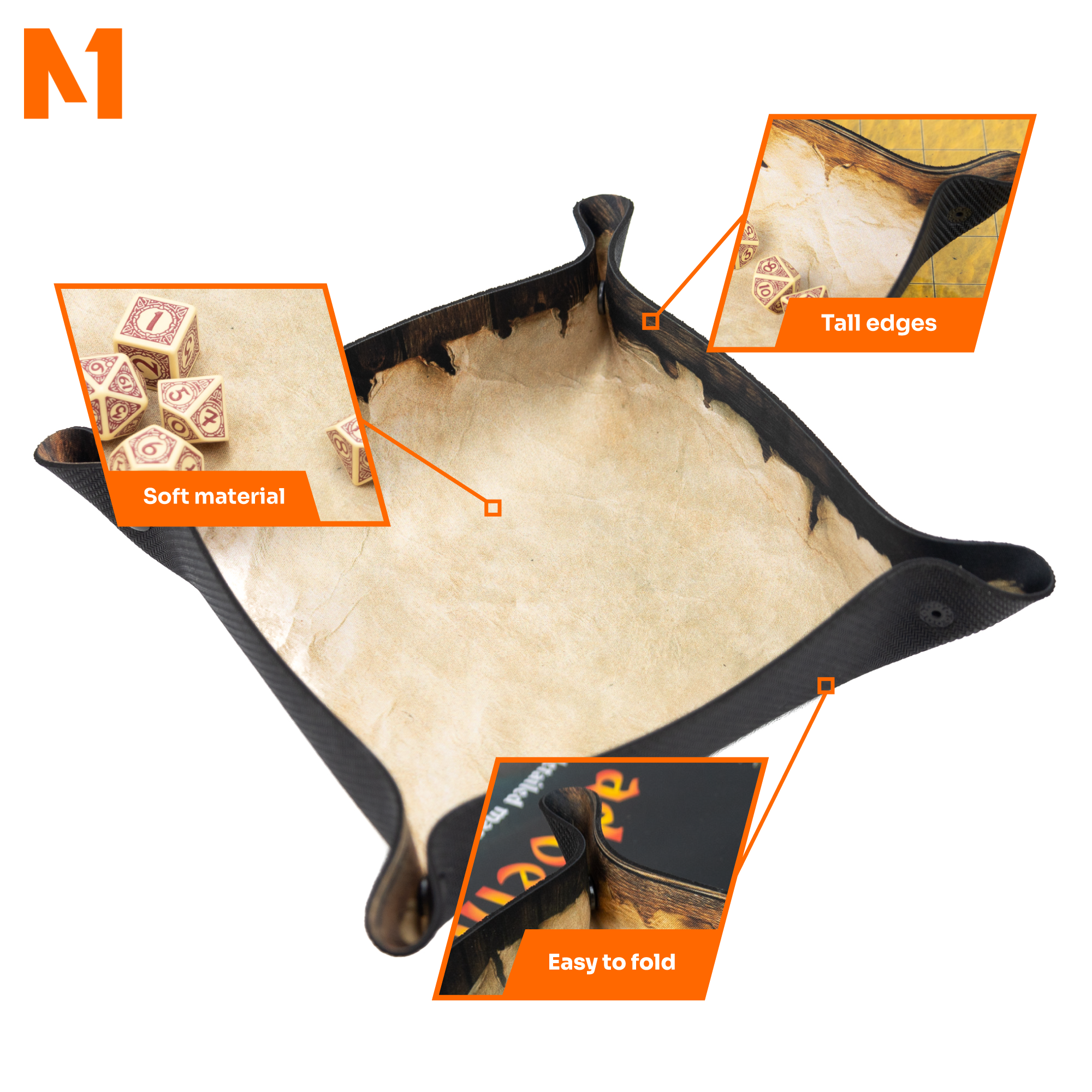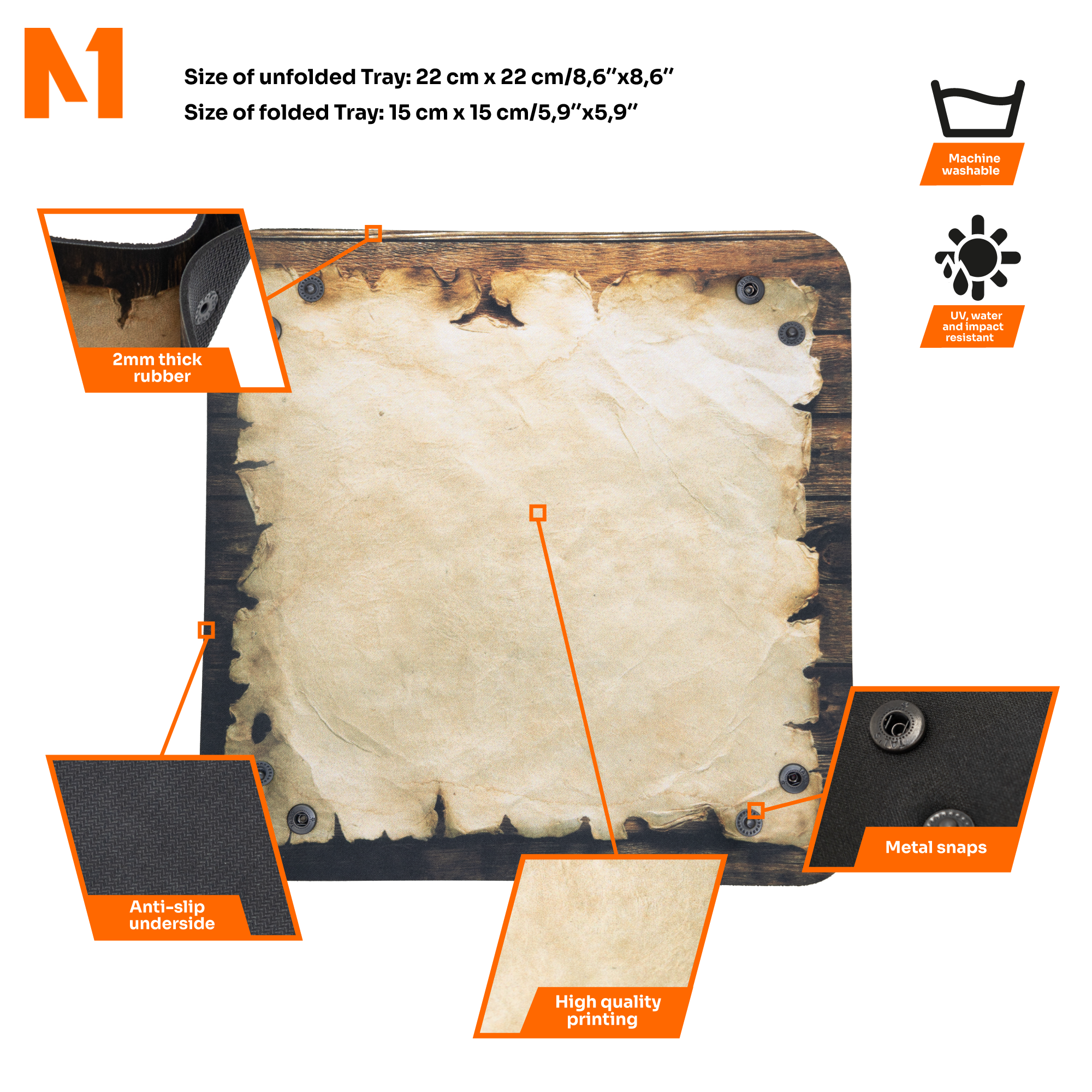 Dice Tray „Papirus” to lekka, przenośna tacka do rzutów kostkami, wykonana z trwałej gumy o grubości 2 mm. Wyjątkowy nadruk inspirowany starożytnym papirem podkreśli klimat Twoich sesji RPG i gier bitewnych, takich jak DnD, Warhammer czy Pathfinder. Idealna na wyjazdy i turnieje!