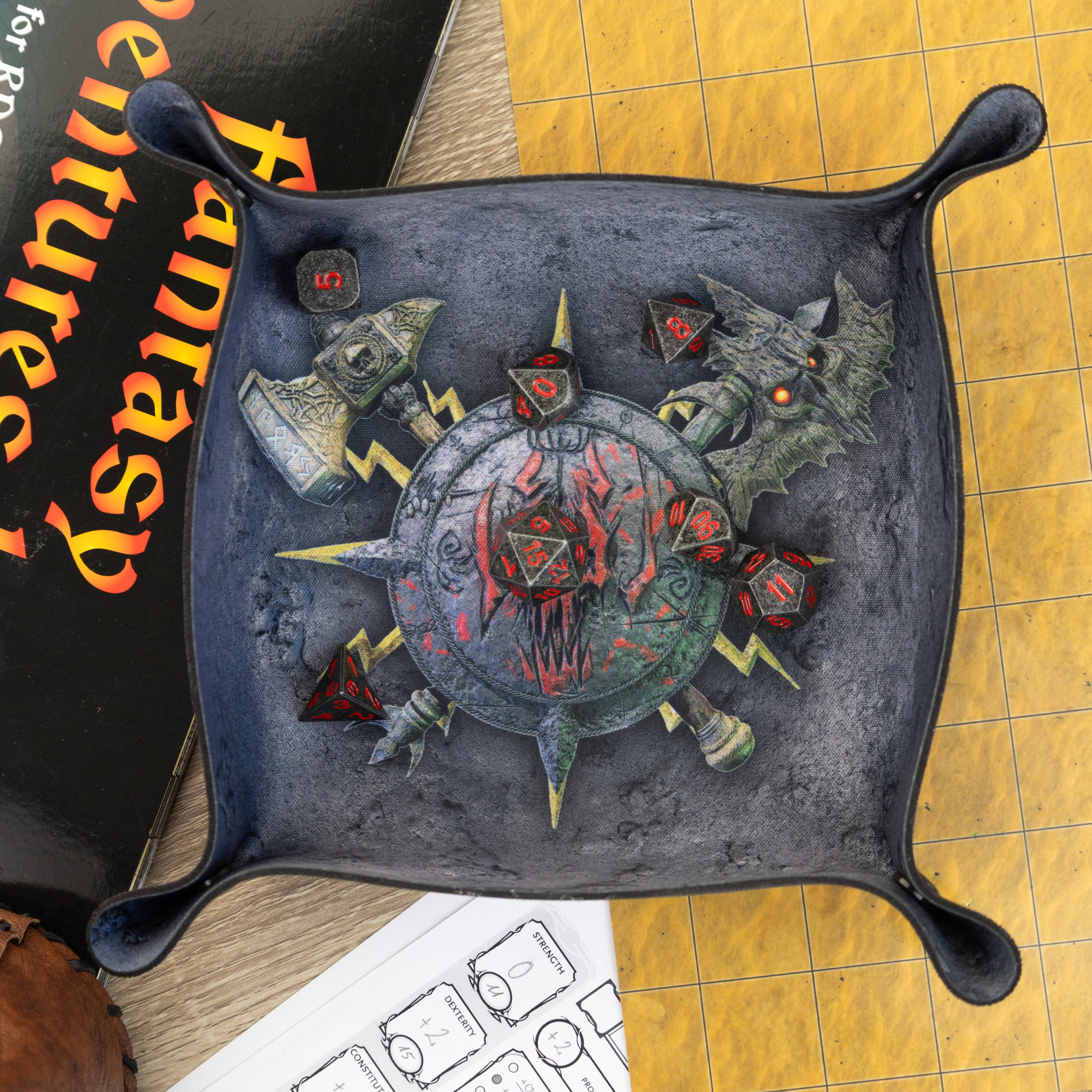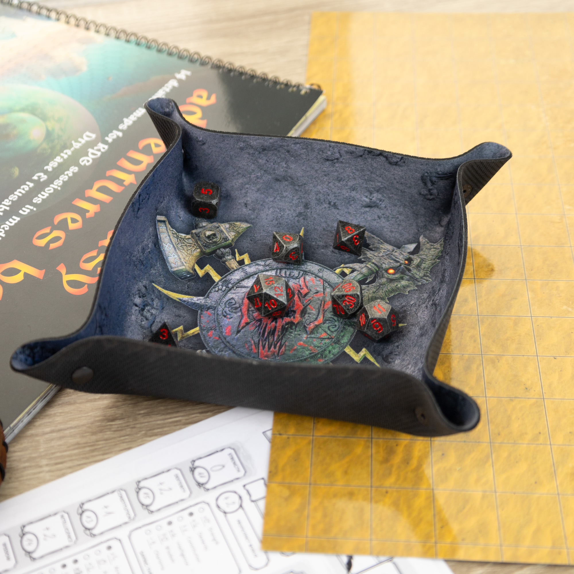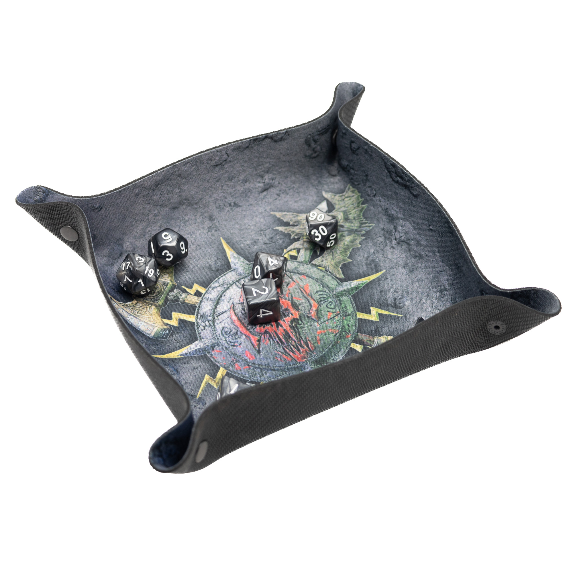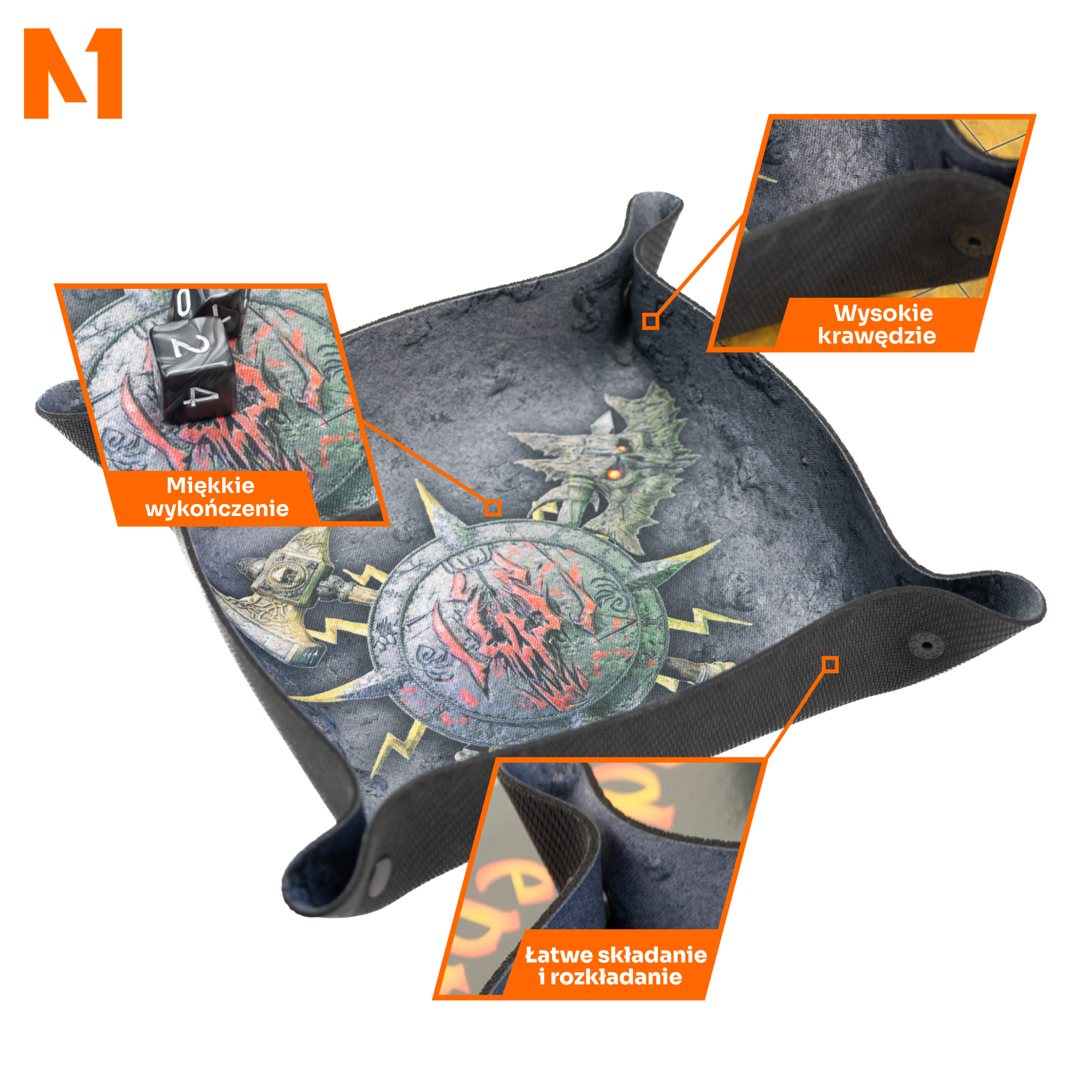 Jednym z największych atutów tej tacki jest jej praktyczna, składana konstrukcja. Dzięki magnetycznym zatrzaskom, tacka jest łatwa w montażu i demontażu, co czyni ją idealnym towarzyszem każdej sesji w podróży. Po złożeniu zajmuje niewiele miejsca, co pozwala na wygodne przechowywanie i transport, a po rozłożeniu oferuje wystarczającą przestrzeń na rzuty wieloma kostkami jednocześnie. Niezależnie od tego, czy walczysz z potężnym smokiem w D&D, czy planujesz strategiczne manewry w Warhammerze, tacka "Skullsplitter" pozwoli Ci skupić się na rozgrywce.