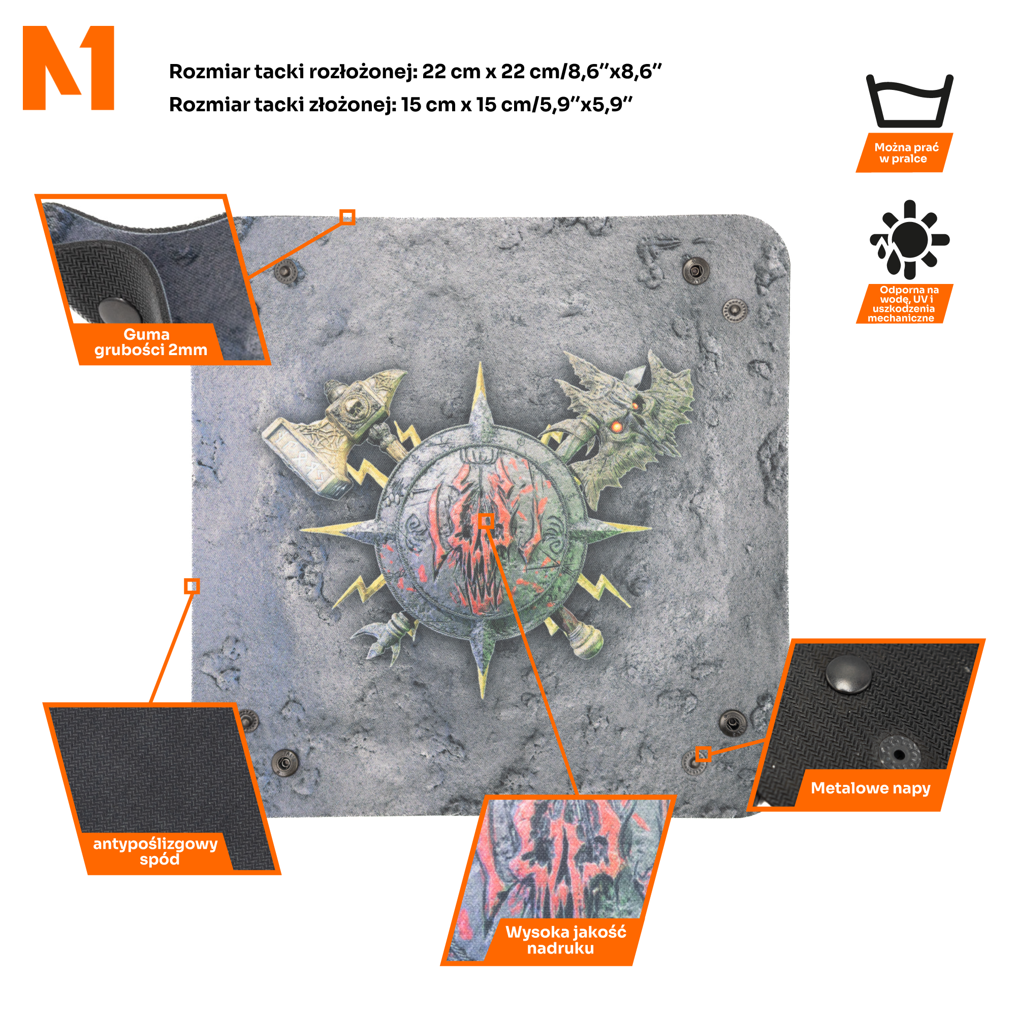 Tacka "Skullsplitter" została wykonana z najwyższej jakości materiałów, co zapewnia jej wyjątkową trwałość, a także pozwala na ciche i precyzyjne rzuty kostkami. Dzięki temu nie musisz martwić się o nieprzewidziane zakłócenia podczas kluczowych momentów gry. Wyjątkowy wzór w środku tacki jest inspirowany mrocznym, wojennym światem, co dodaje głębi i unikalności każdej bitwie, w której bierzesz udział.