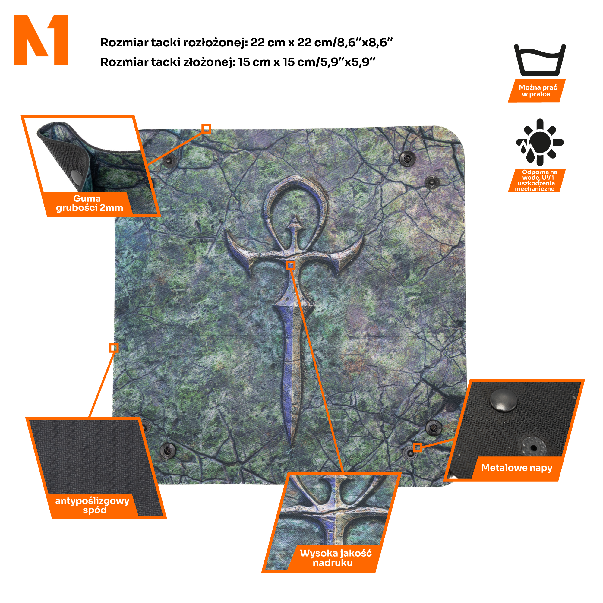 Tacka została wykonana z wysokiej jakości materiałów, które zapewniają jej trwałość i odporność na zniszczenia, nawet podczas najbardziej intensywnych sesji. Dzięki specjalnej konstrukcji tacka gwarantuje ciche i precyzyjne rzuty kostkami, co jest nieocenione w trakcie emocjonujących momentów gry. Wampirzy klimat tacki "Wampirzy Ankh" idealnie komponuje się z każdą grą o mrocznej estetyce, wprowadzając graczy w gotycki świat pełen tajemnic i nadprzyrodzonych mocy.