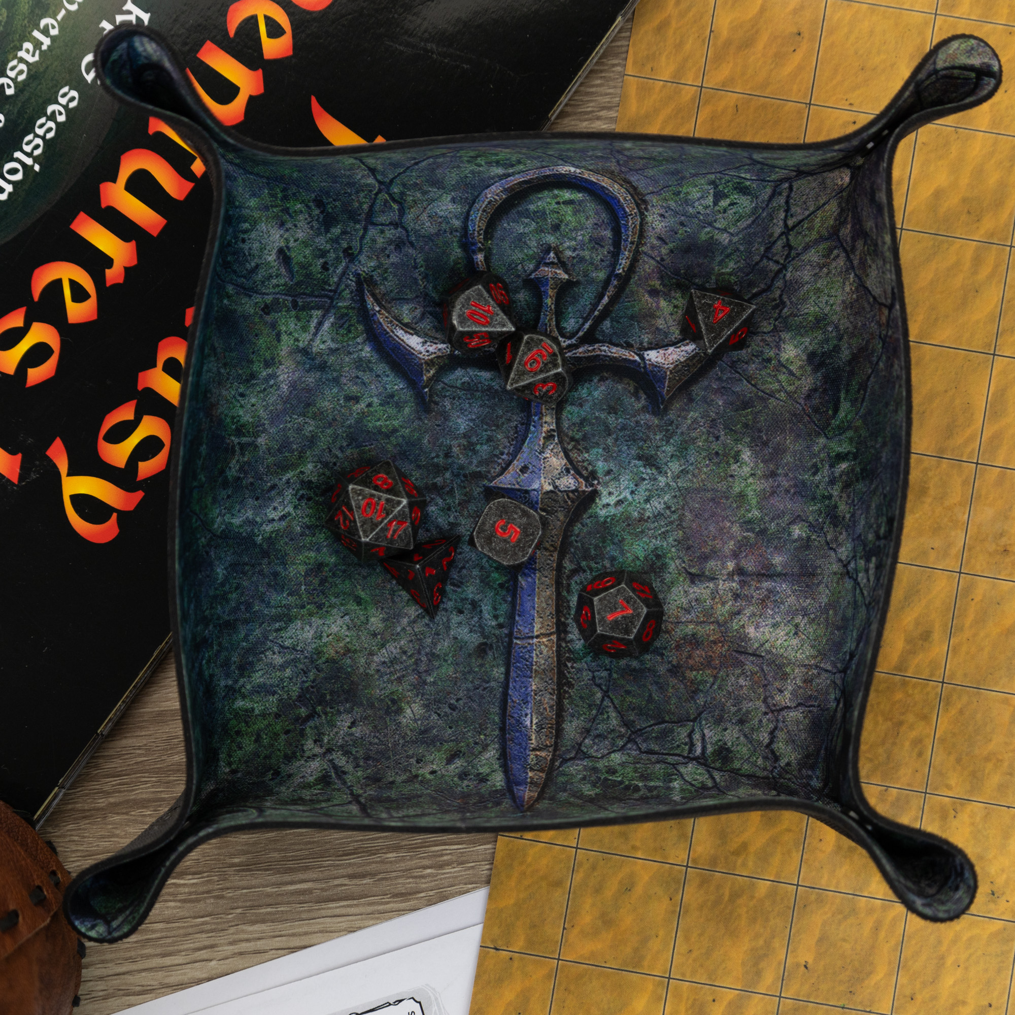 Dice Tray "Wampirzy Ankh" to tajemnicza tacka do rzutów kostkami, idealna do gier bitewnych, planszowych i RPG, takich jak Dungeons & Dragons czy Vampire: The Masquerade. Wzór inspirowany symbolem ankh otoczonym gotycką estetyką wprowadza mroczny klimat do każdej rozgrywki. Składana konstrukcja ułatwia transport, a wytrzymałe materiały gwarantują długotrwałe użytkowanie.
