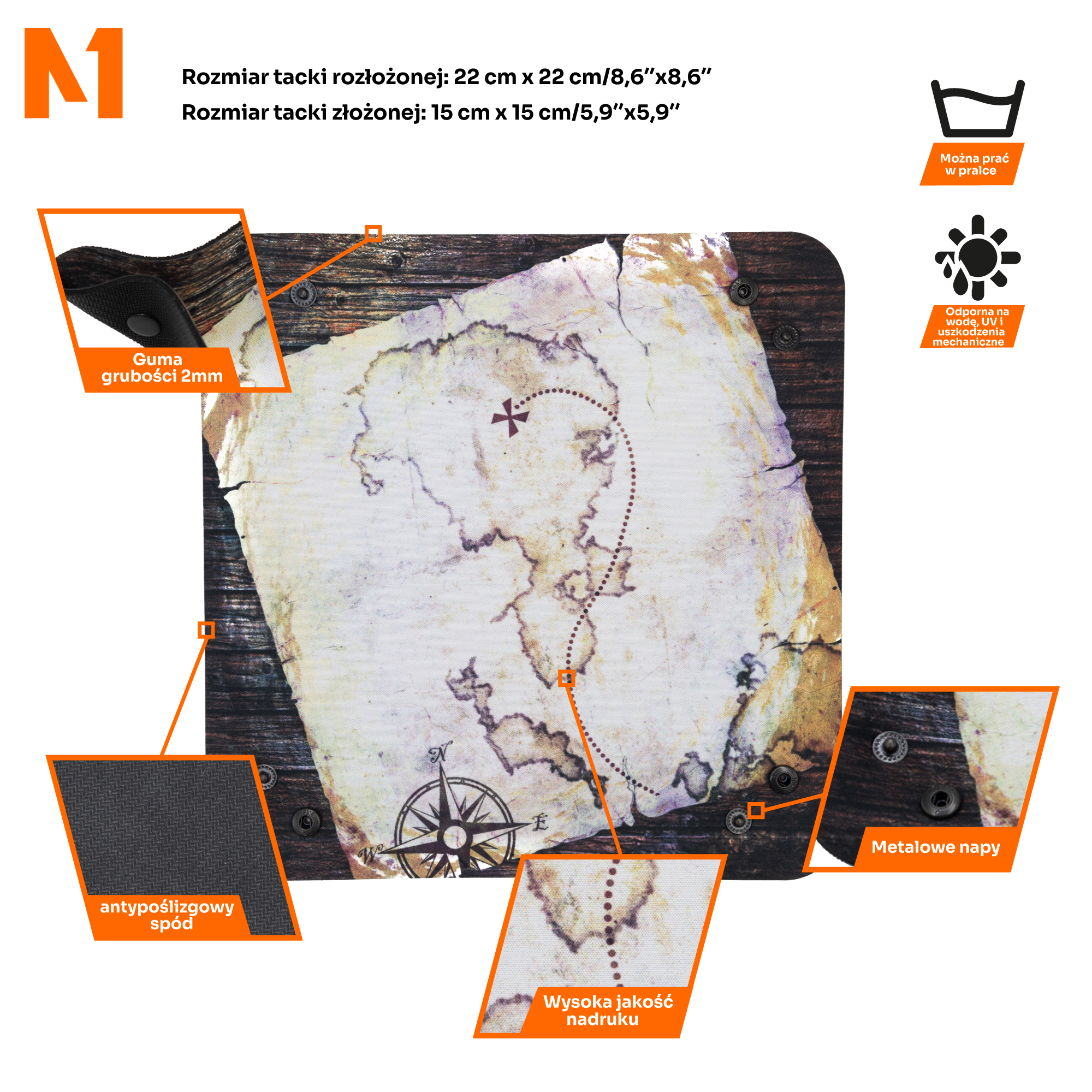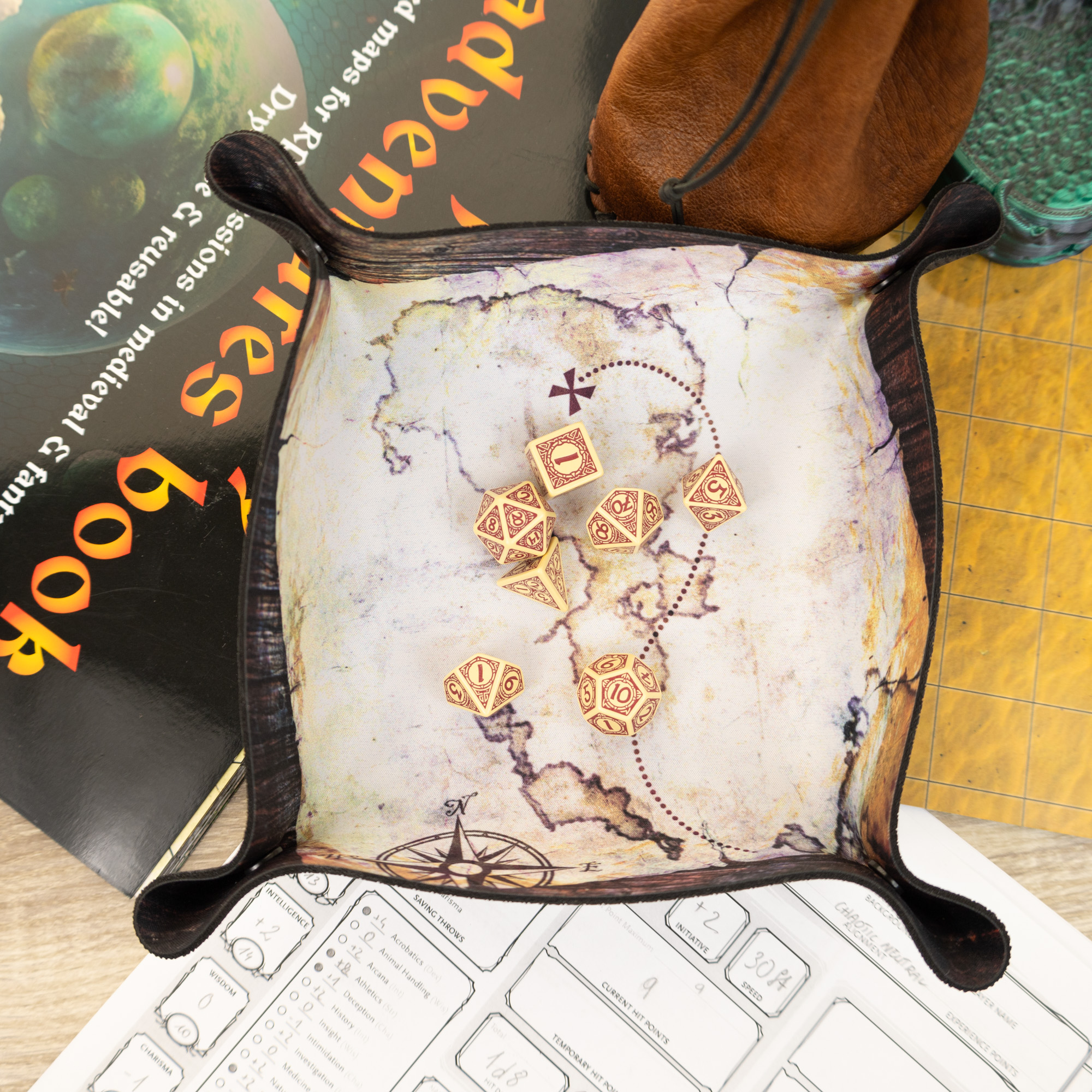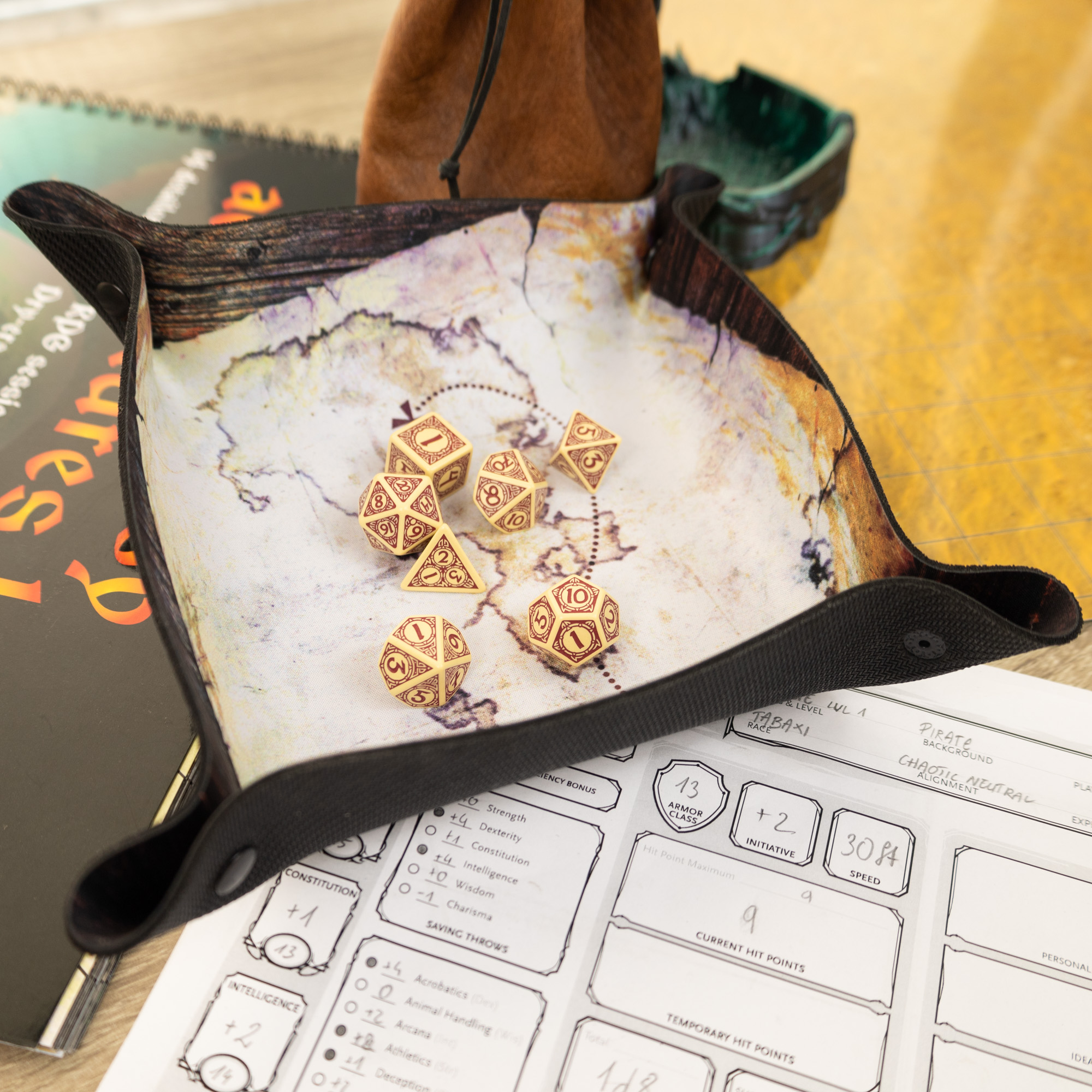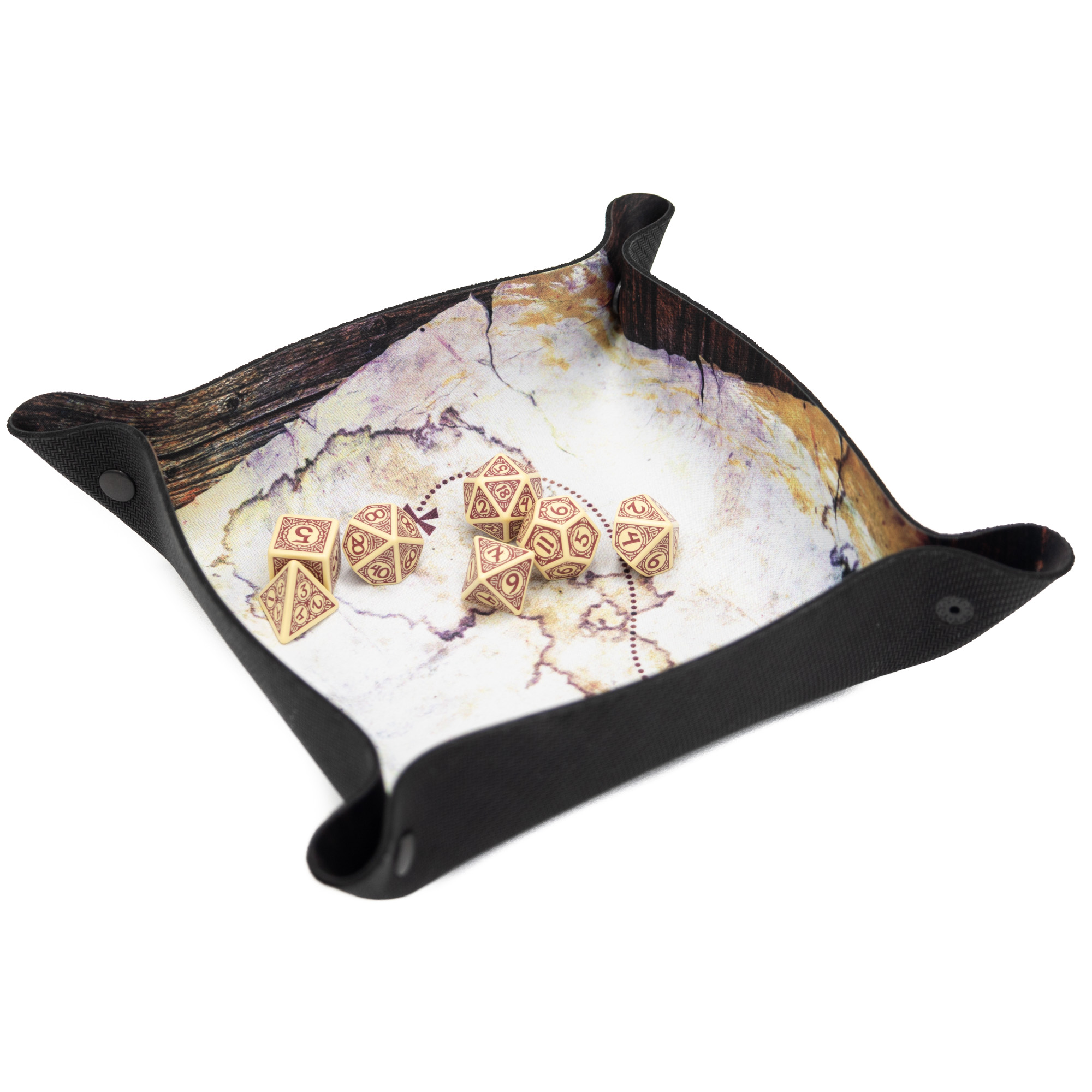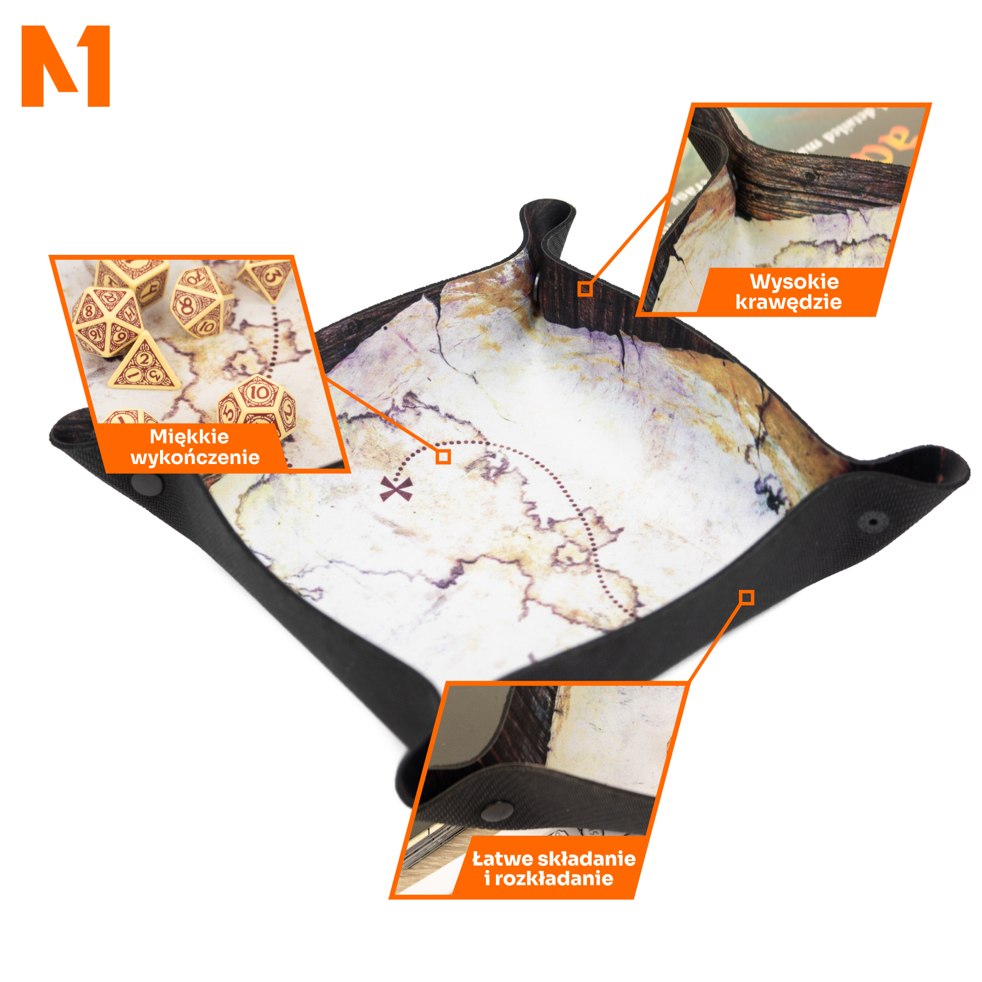 Dice Tray "Zapomniana Wyspa" to idealna tacka do rzutów kostkami, pasująca do gier bitewnych, planszowych i RPG, takich jak Dungeons & Dragons czy Pathfinder. Ozdobiona grafiką starej mapy skarbu, tacka wprowadza klimat przygody i tajemnicy do każdej sesji. Wykonana z trwałych materiałów, składana konstrukcja ułatwia transport i przechowywanie.