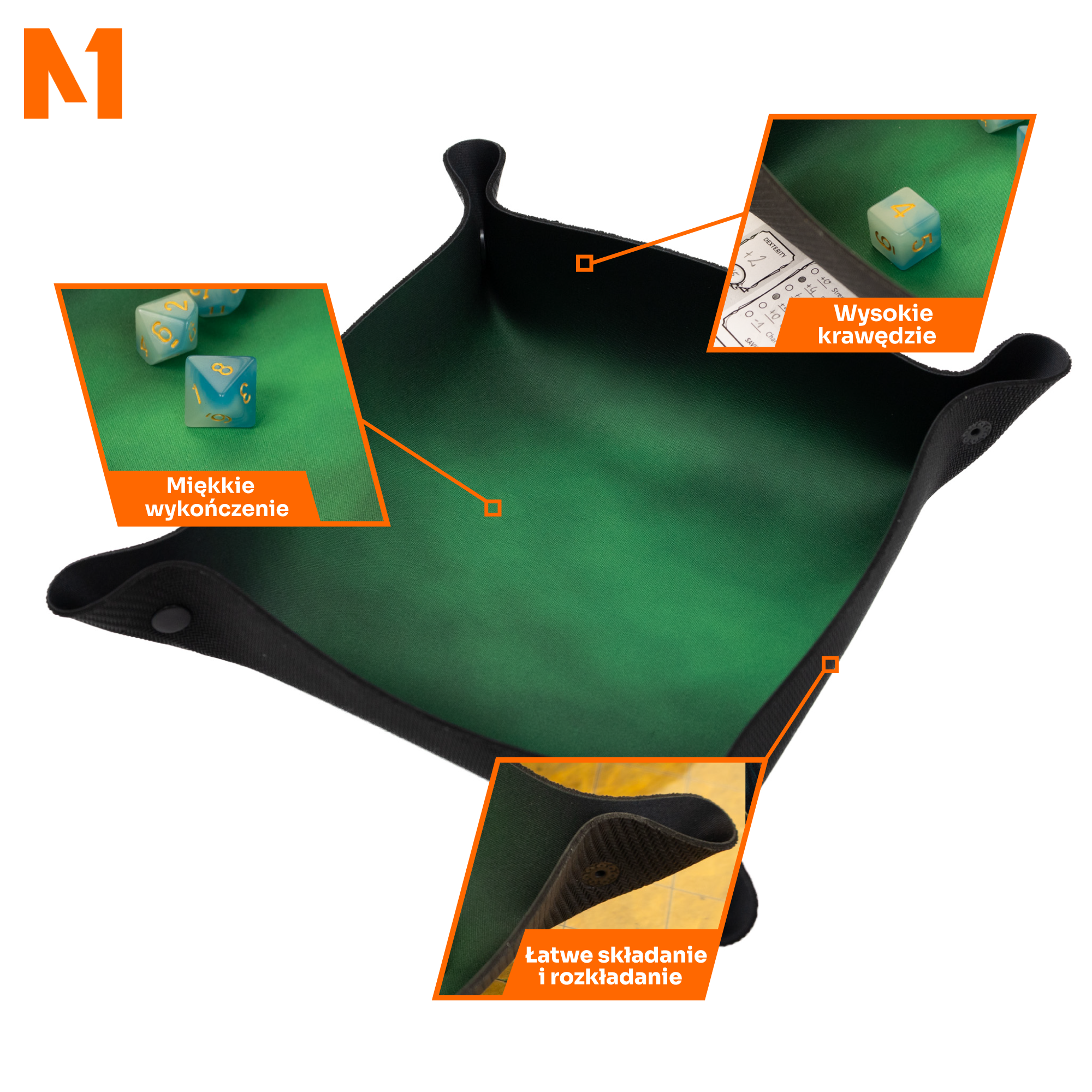 Tacka "Zielony dym" jest również niezwykle praktyczna – dzięki składanej konstrukcji można ją łatwo złożyć, co czyni ją wygodną do transportu i przechowywania. Magnetyczne zatrzaski pozwalają na szybkie złożenie i rozłożenie tacki, dzięki czemu jest zawsze gotowa do gry, niezależnie od tego, gdzie się znajdujesz. Jej kompaktowe rozmiary po złożeniu sprawiają, że łatwo zmieści się w torbie czy plecaku, będąc idealnym towarzyszem na sesje RPG u znajomych, turnieje bitewne lub konwenty.