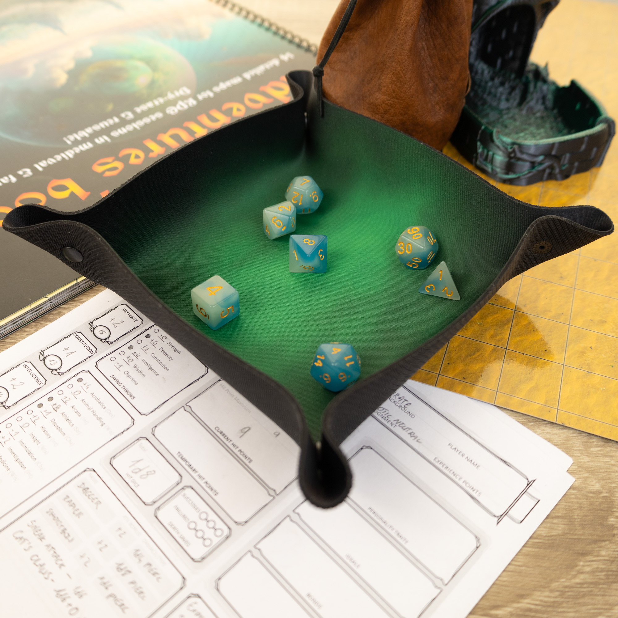 Wykonana z wysokiej jakości materiałów, tacka "Zielony dym" jest wytrzymała i solidna, co gwarantuje długotrwałe użytkowanie nawet podczas intensywnych sesji gry. Dzięki stabilnej konstrukcji tacka umożliwia ciche i precyzyjne rzuty kostkami, co pozwala graczom w pełni skoncentrować się na rozgrywce, bez zakłóceń. Wnętrze tacki, pokryte zielonym gradientem, nadaje jej elegancji i wyrafinowanego stylu, doskonale współgrając z motywami natury, tajemniczej magii i zielonych krain.