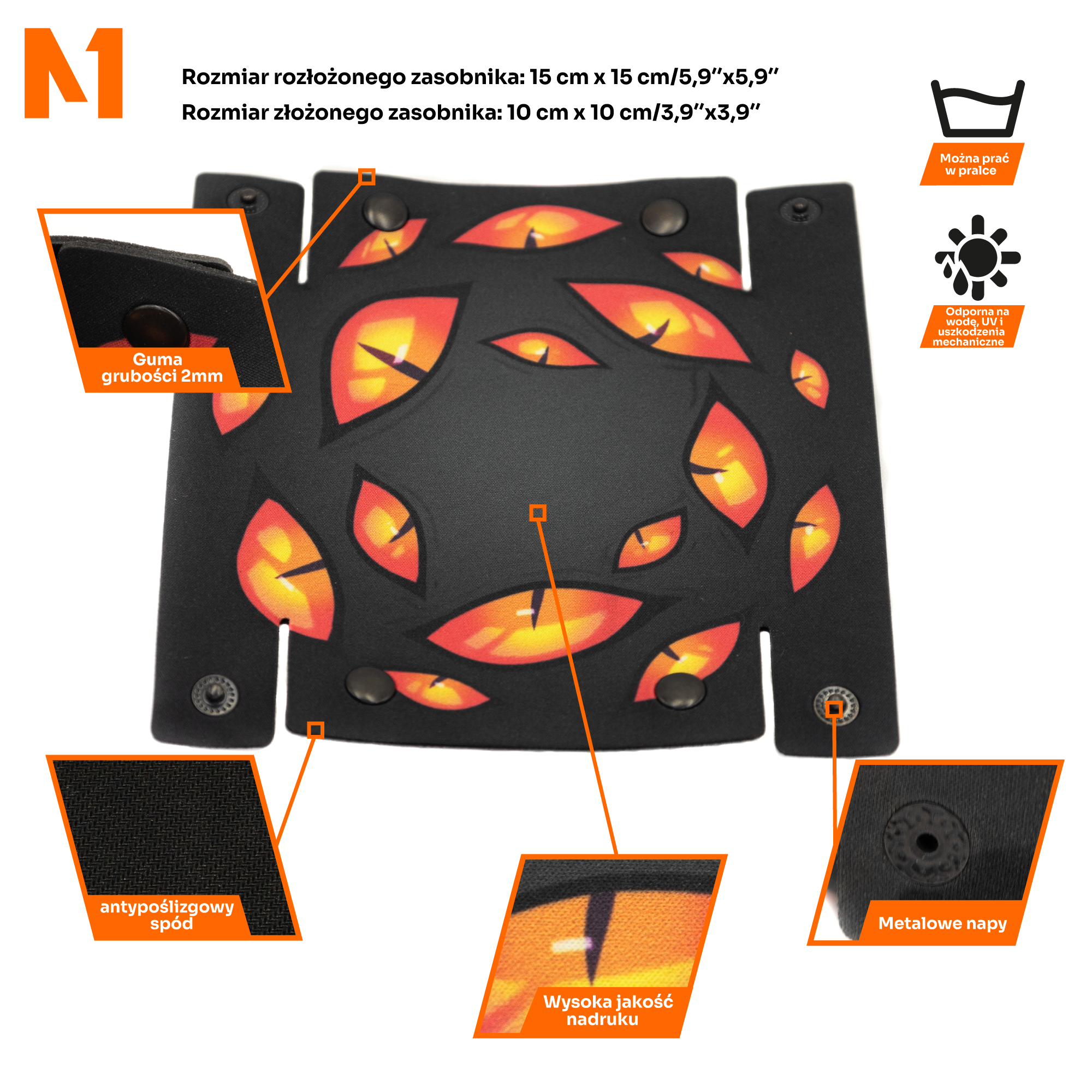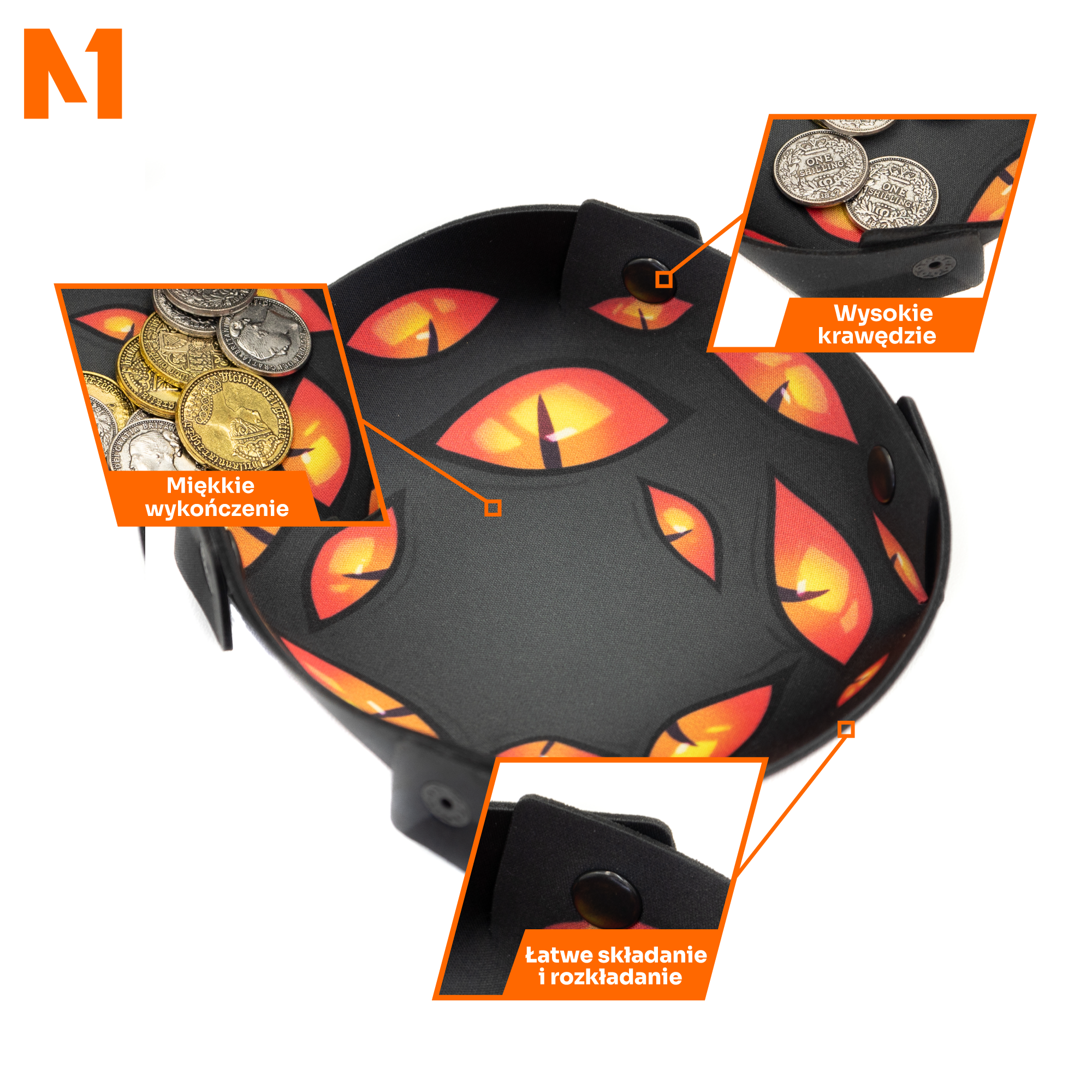 - Wysoka jakość wykonania: Zasobnik "Oczy w Ciemności" jest wykonany z trwałych materiałów, które gwarantują długotrwałe użytkowanie i ochronę Twoich akcesoriów do gier.
